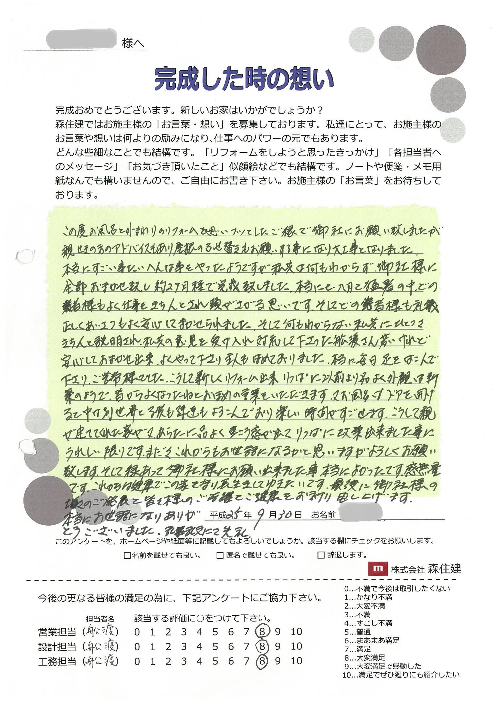 この度お風呂と外まわりのリフォームをと思い フッとしたご縁で御社にお願い致しましたが、親戚の方のアドバイスもあり屋根の葺せ替えもお願いすることになり大工事となりました。 本当にすごい事たいへんな事をやったようですが、私共は何もわからず、御社様に全部おまかせ致し、約2ヶ月程で完成致しました。 本当に七、八月と猛暑の中、どの業者様もよく仕事をきちんとされ頭がさがる思いです。そしてどの業者様も礼儀正しく、あいさつもよく安心して任せられました。 そして何もわからない私共にひとつひとつきちんと説明され、私共の意見を受け入れ対応して下さった舩渡さん、若いけれど安心してお任せ出来、よくやって下さり主人もほめておりました。本当に毎日足を運んで下さり、ご苦労様でした。 こうして新しくリフォーム出来、りっぱに以前より品よく外観は新築のようで、皆からよくなったねとお褒めの言葉をいただきます。また、お風呂はドアを開けると中は別世界と子供も孫達もよろこんでおり、楽しい時間がすごせます。 こうして親が建ててくれた家がまた新たに品よく重厚感が出てりっぱに改築出来ました事にうれしい限りです。まだまだお世話になるかと思いますが、よろしくお願い致します。そして縁あって御社様にお願い出来ました事、本当によかったです。感無量です。これからは健康でこの家でより長生きしてゆきたいです。最後に御社様の益々のご発展と皆々様のご活躍とご健康をお祈り申し上げます。本当にお世話になりありがとうございました。乱筆乱文にて失礼。