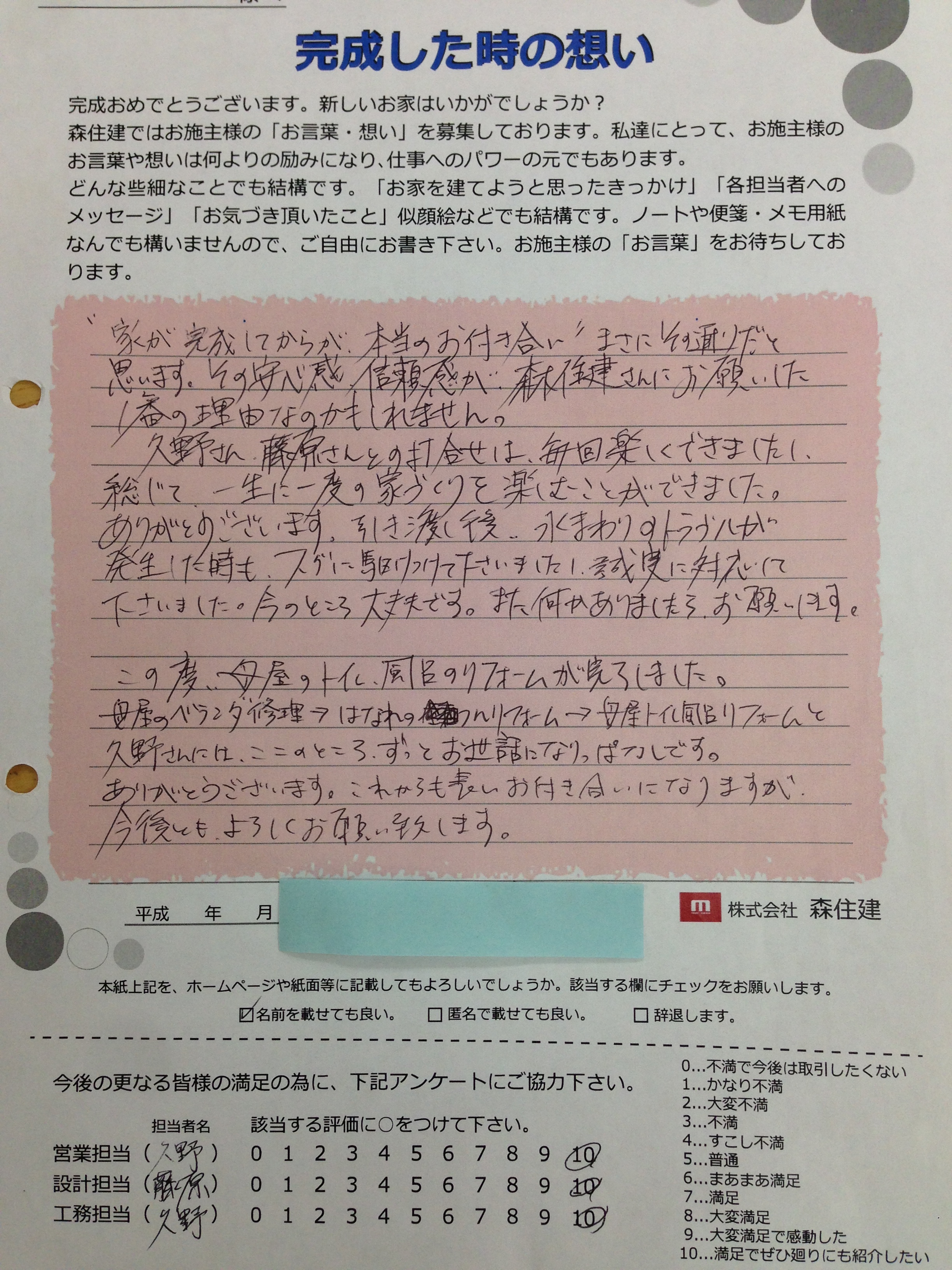 家が完成してからが本当のお付き合い。 まさにその通りだと思います。その安心感、信頼感が森住建にお願いした 一番の理由なのかもしれません。 久野さん、藤原さんとの打ち合わせは毎回楽しく出来ましたし 総じて一生に一度の家づくりを楽しむ事が出来ました。有難うございます。 引渡し後、水回りのトラブルが発生した時もスグに駆けつけてくれましたし、 誠実に対応して下さいました。今のところ大丈夫です。 また何かありましたらお願いします。 この度は母屋のトイレ、風呂のリフォームが完了しました。 母屋のベランダ修理 → 離れのフルリフォーム → 母屋のトイレ風呂リフォームと久野さんにはここのところずっとお世話になりっぱなしです。 有難うございます。これからも長いお付き合いになりますが 今後ともよろしくお願い致します。