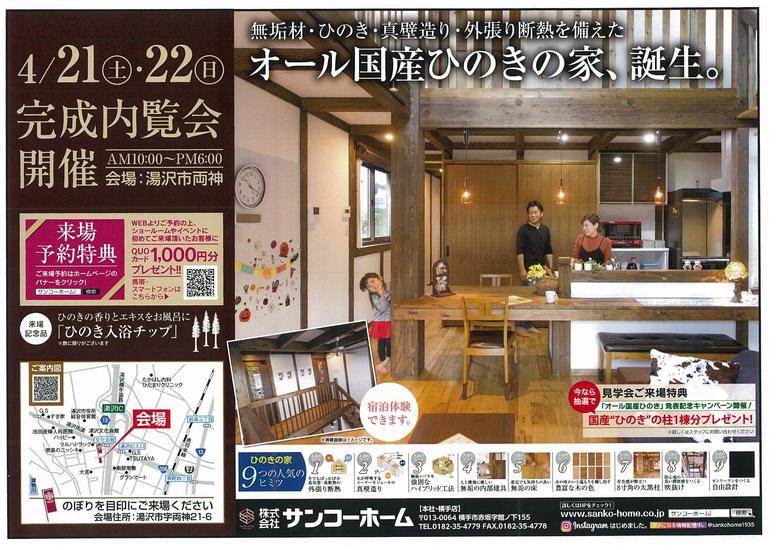 サンコーホーム「オール国産ひのきの家」見学会を開催いたします。