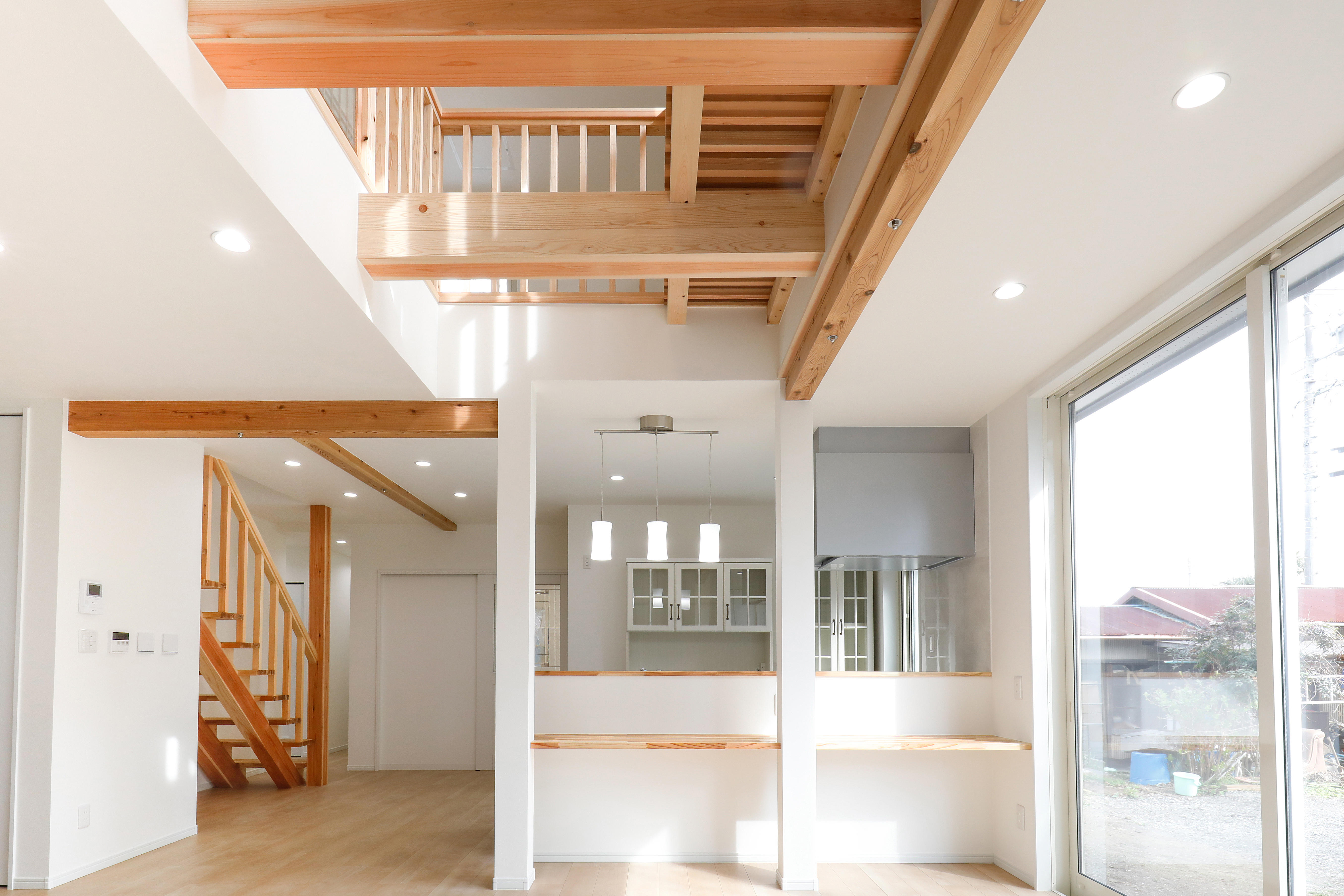 吹き抜けにして開放感をもたせ、大きな窓からは庭が一望できるようにしました。南北に窓を設けたり、会談の直線状にも扉を設け涼風と光を取りこめます。リビングを広くした分、寒さ対策としてガス床暖房にしました。