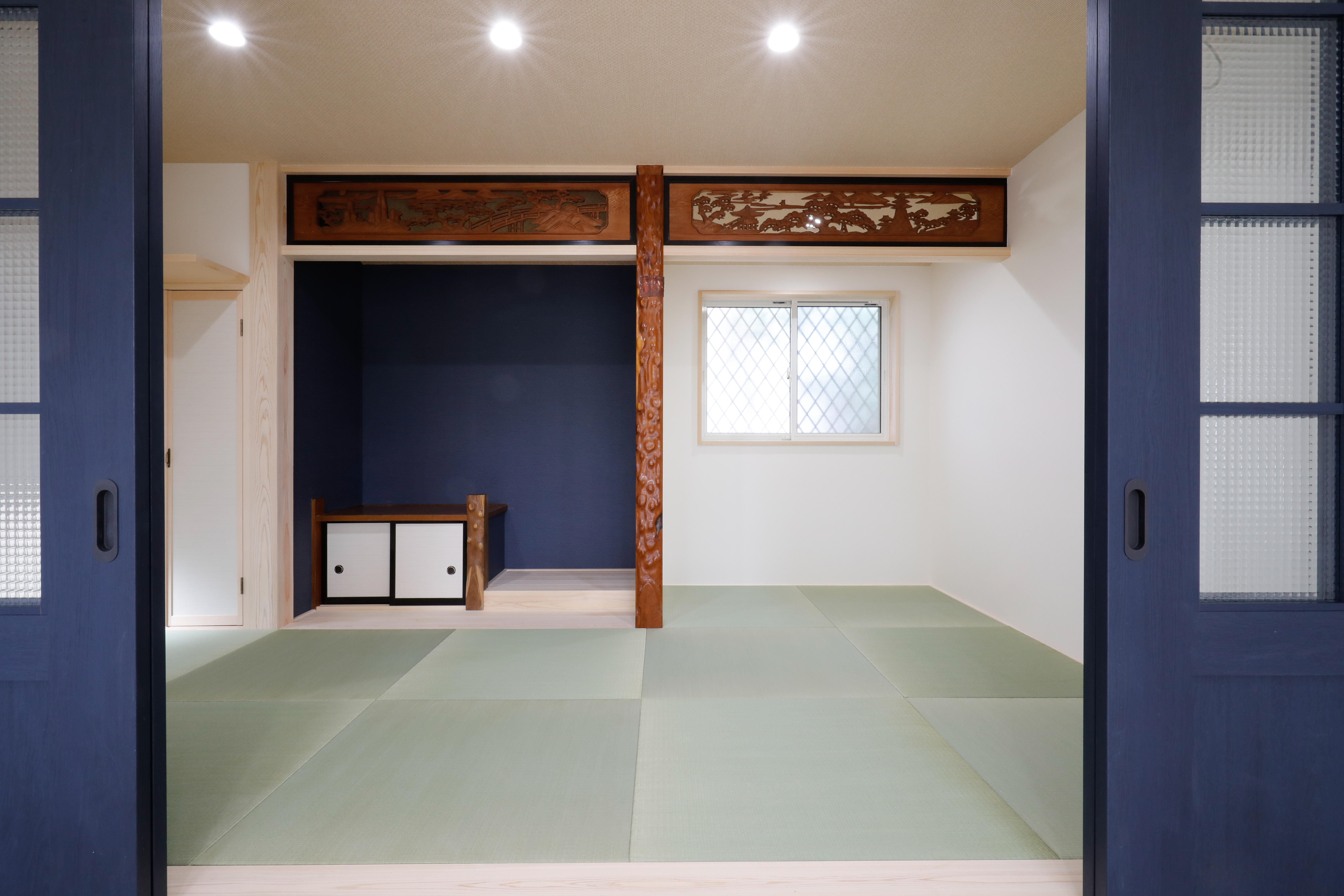 リビング横の祖霊舎の場所は変えずに旧宅の欄間を組み込みました。