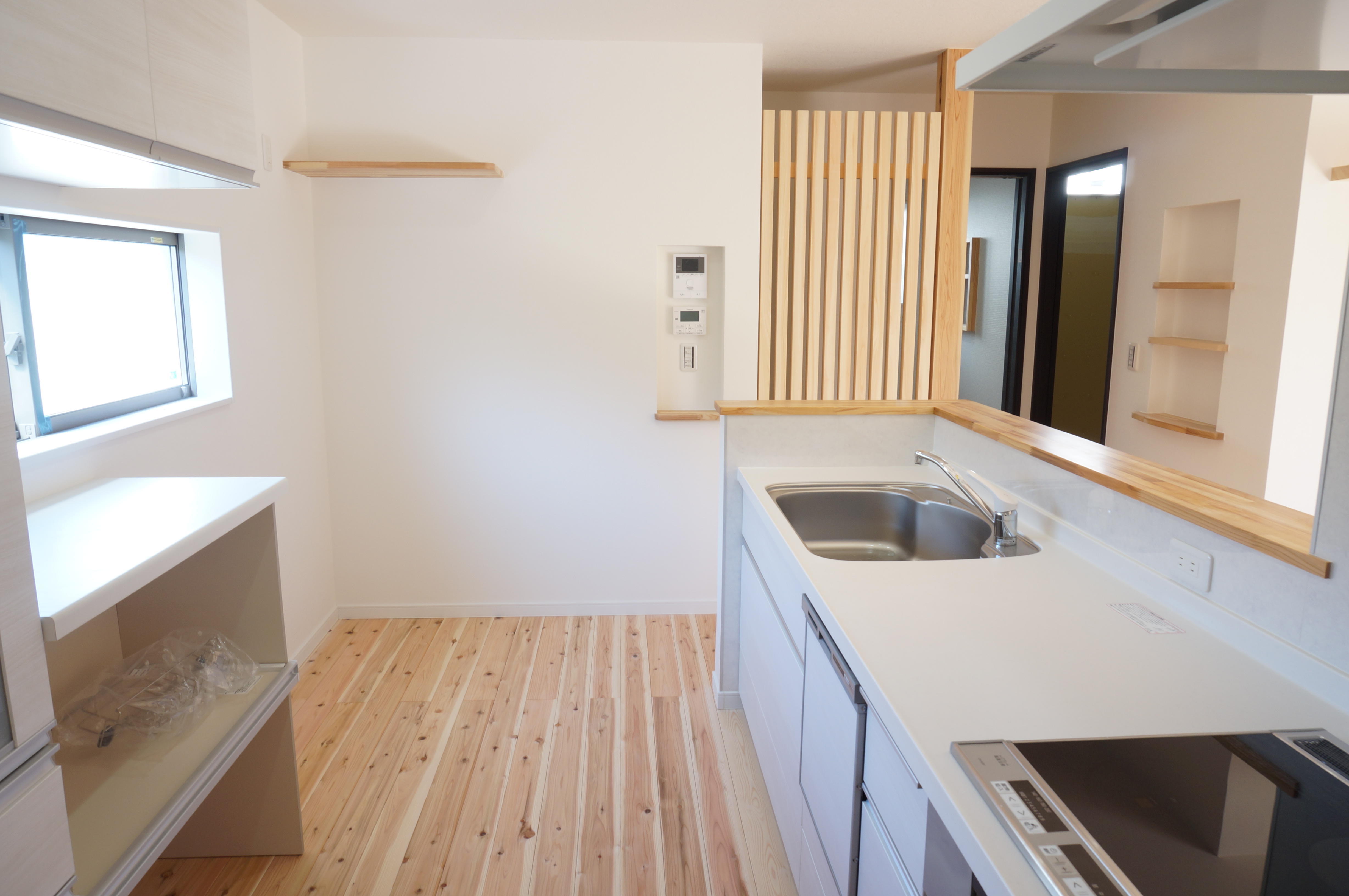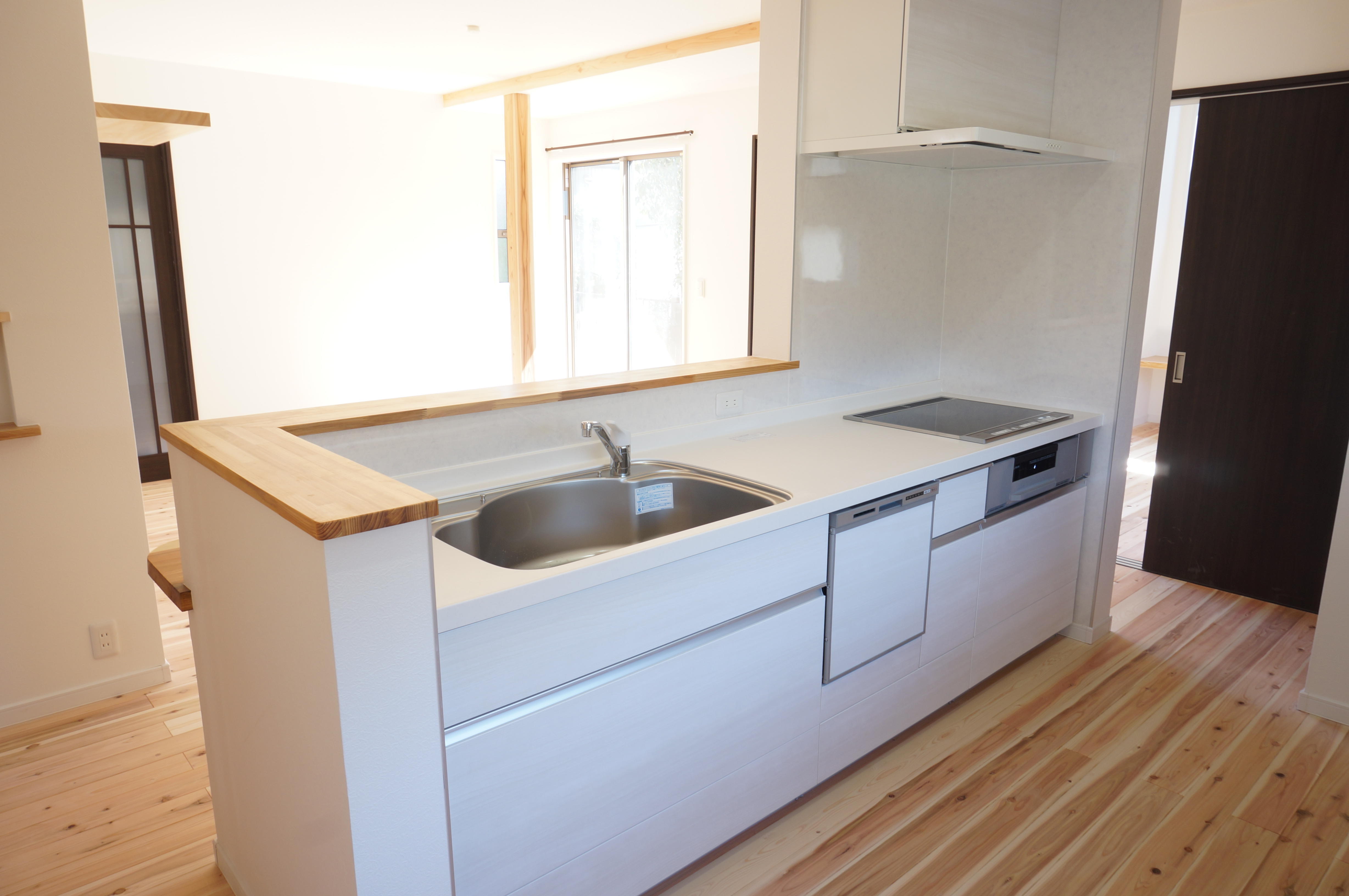 壁付型から造作壁を配した対面型キッチンにがらりと変更。 リビングを眺めながらも、落ち着いて調理もできる空間へとなりました。 左右どちらからもキッチンへ入れる為、効率的な作業動線もとれ 使い勝手も格段に上がりました。