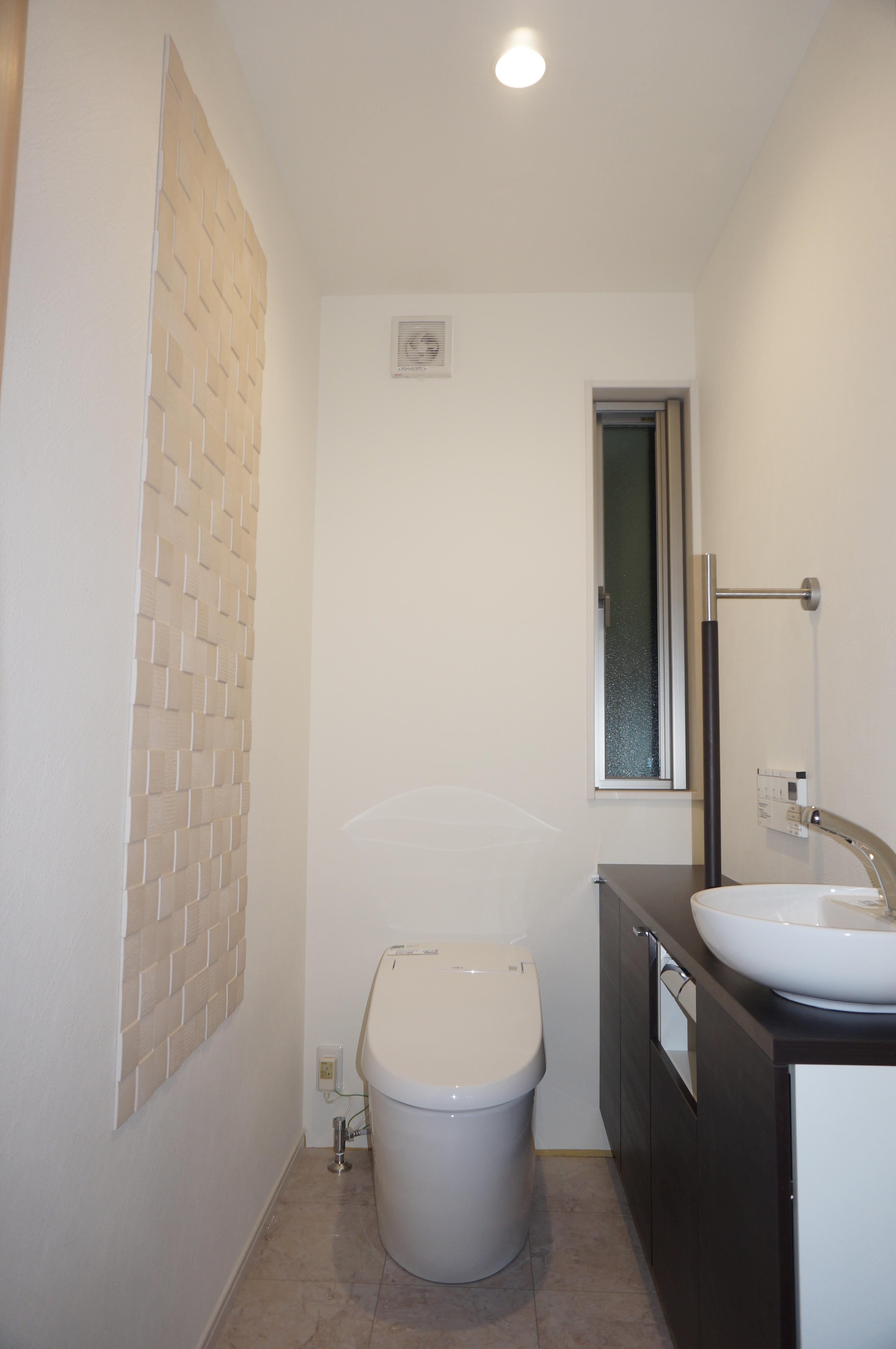 男子用小便器を取り外しての間取り変更+トイレリフォーム 壁面に配した「エコカラット」は消臭機能がありながら、 デザイン性にも優れているので、トイレ空間をさりげなく快適に 演出してくれます。 また、手洗器が一体となったカウンターとタンクレストイレで すっきりとしたスペースを作ります