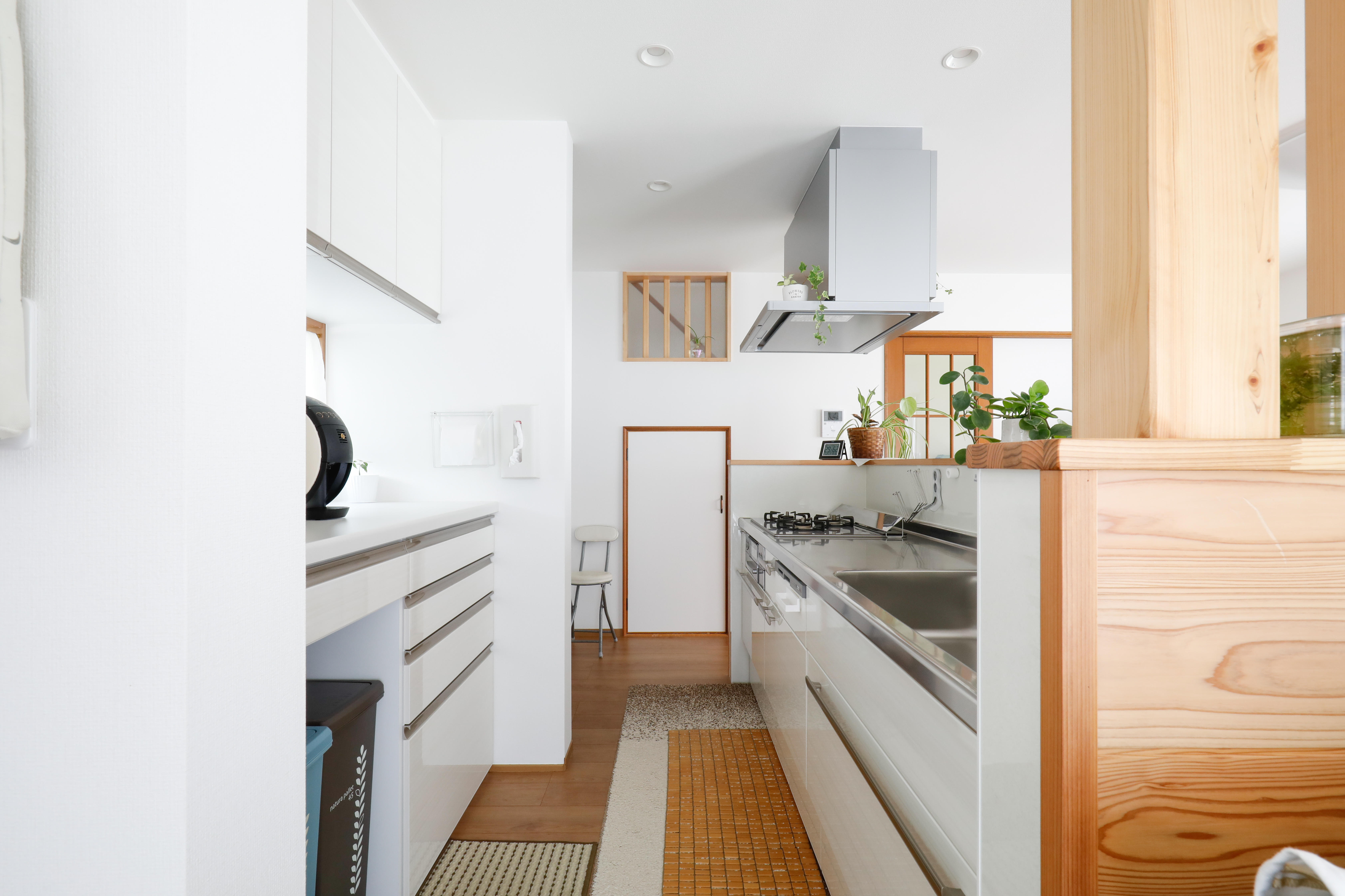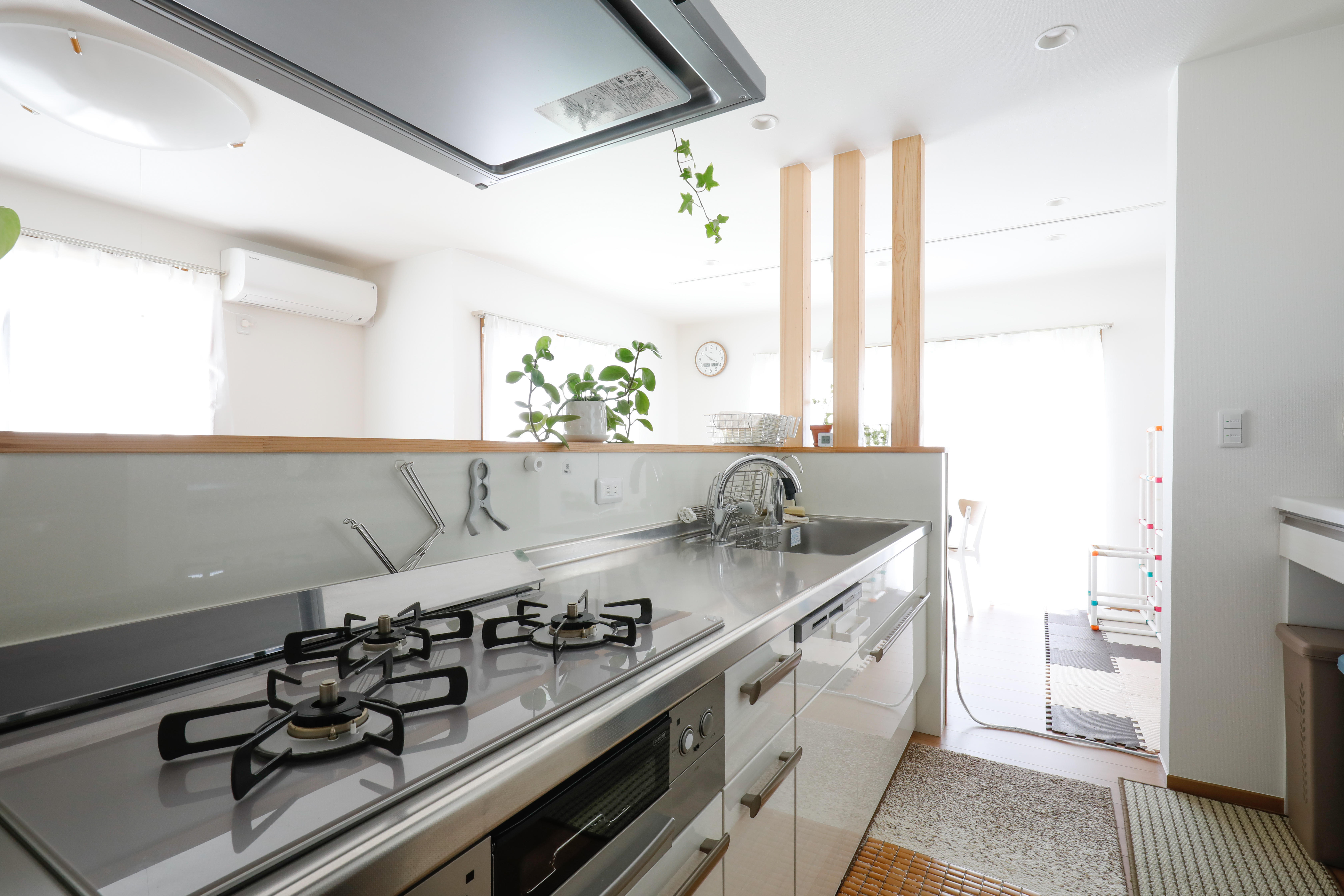 作業スペースが十分ではなかったコンパクトキッチンからの 華麗なリフォーム。 造作壁対面キッチンのレイアウトで見られたくない手元は隠し、 作業しやすい動線も確保しました。