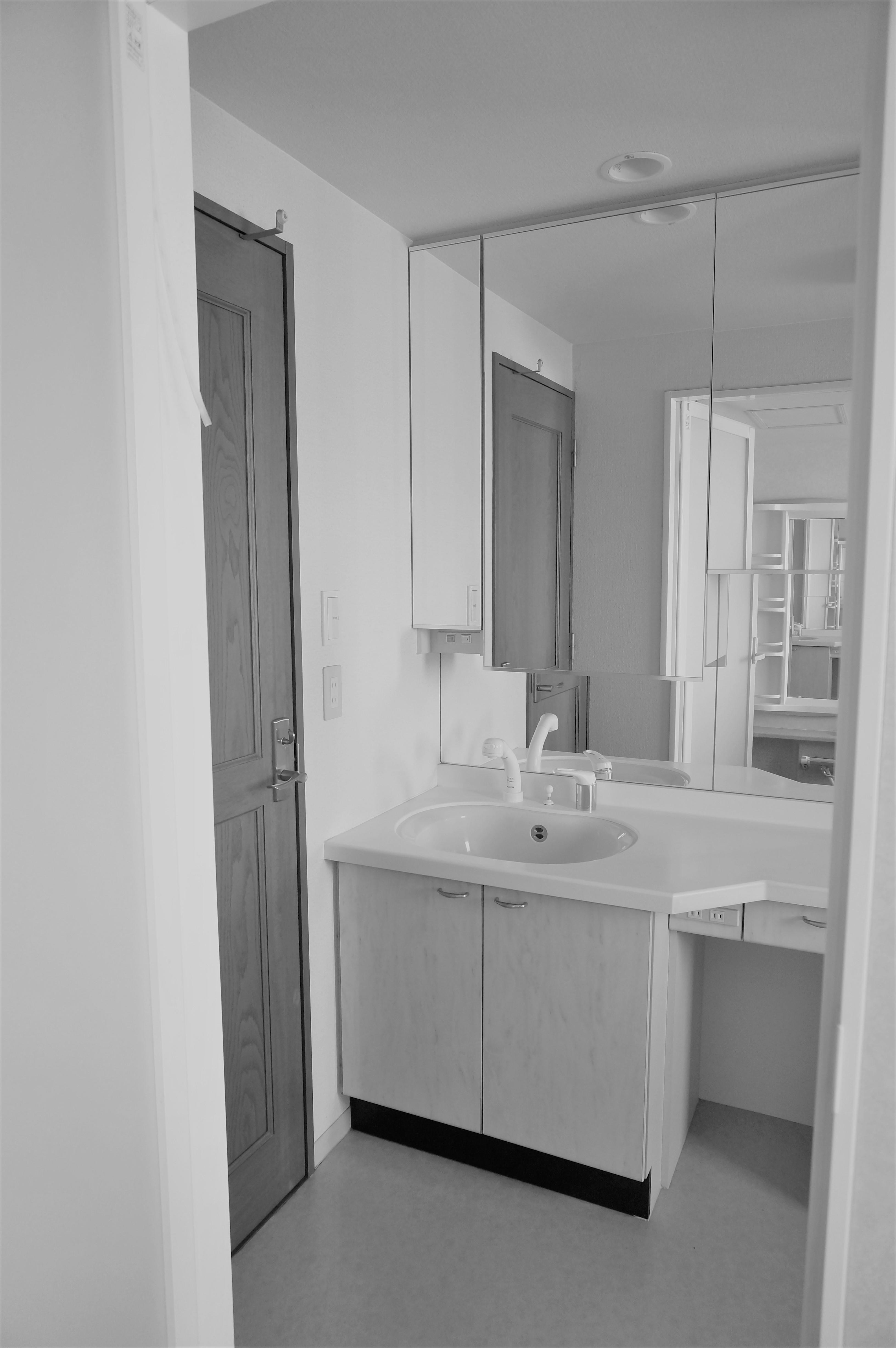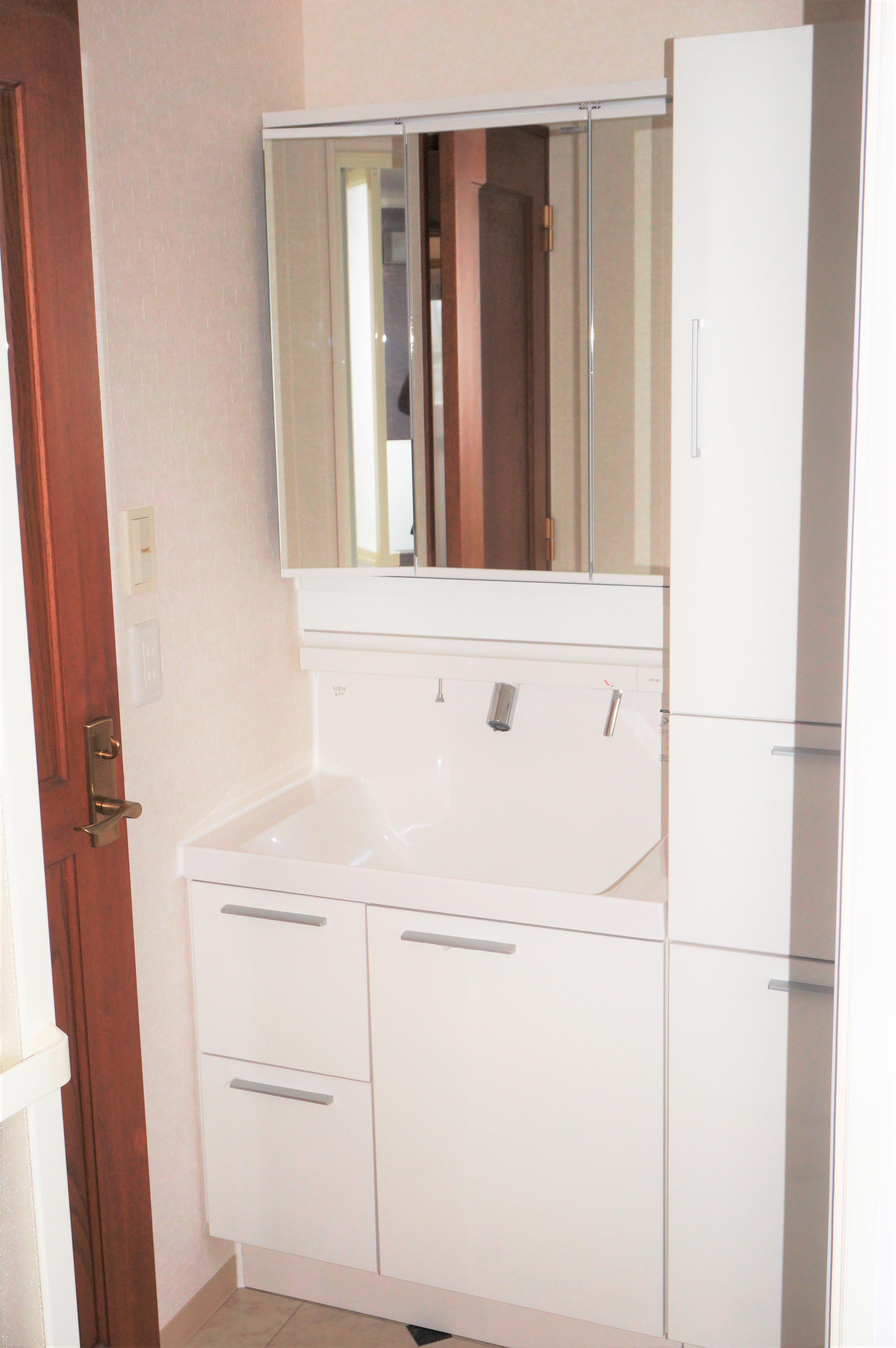 洗面ボールとカウンターが一体になった洗面化粧台は 手入れもラクラク。水栓も上部にある為、 見た目もスッキリ、汚れにくく、お掃除も簡単です。 ◆商品:L.C.