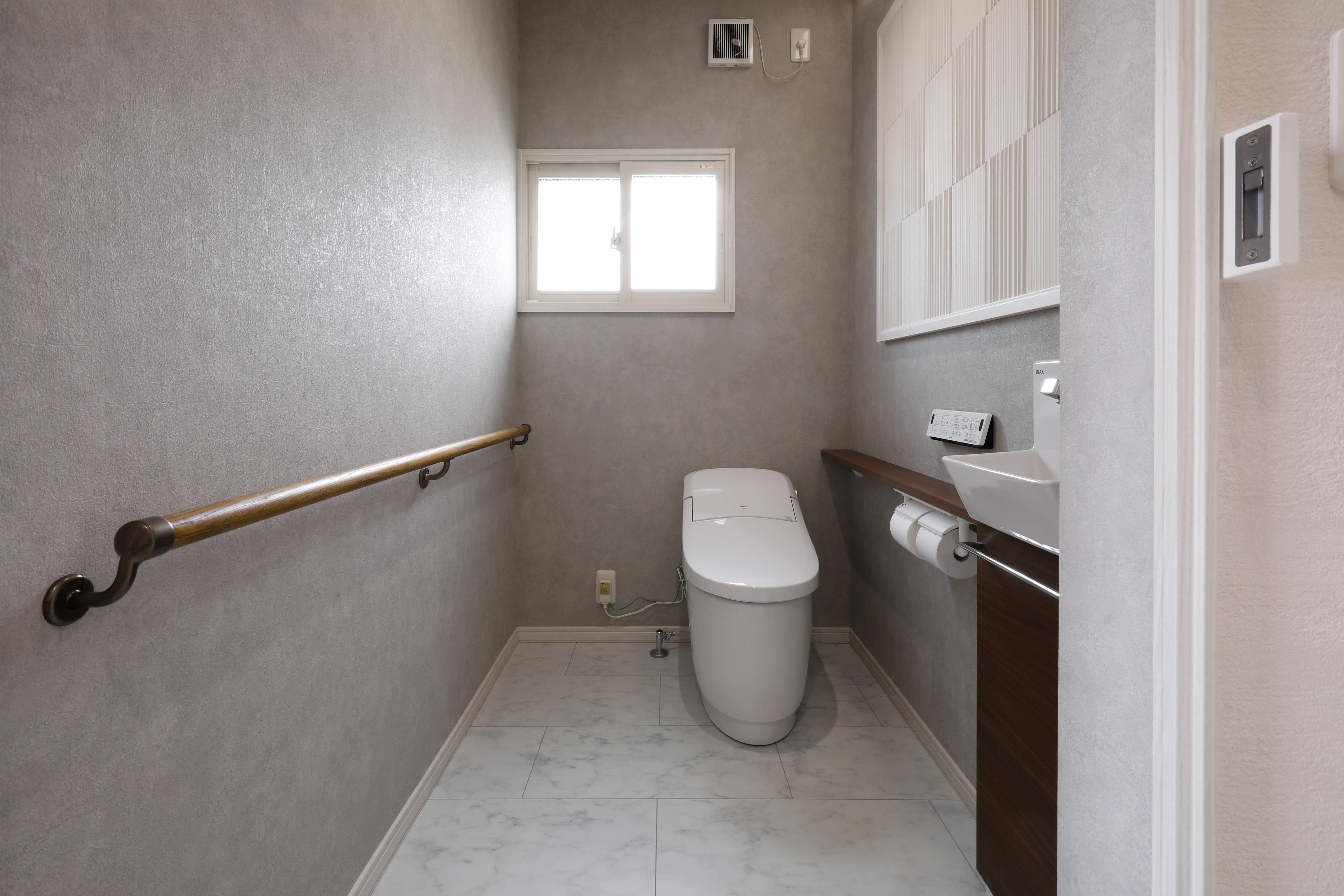 流線的なフォルムのトイレと手洗い付のカウンターで モダンでスタイリッシュなトイレ空間を実現! さらにエコカラットを壁に取付けることにより 意匠と同時に消臭機能も兼ね備えています。
