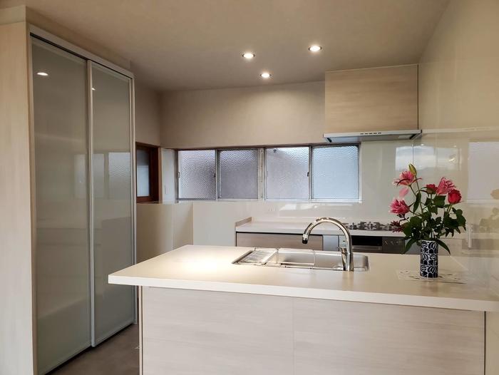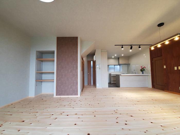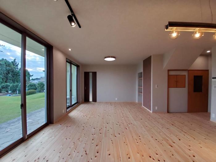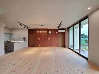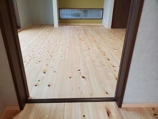 こあがりだった続き間の和室とリビングダイニングをバリアフリーにした1フロアリノベーションです 地元の桧のフローリングを使用して心地よい空間に仕上がりました キッチンの動線もコンパクトで使いやすくなっています