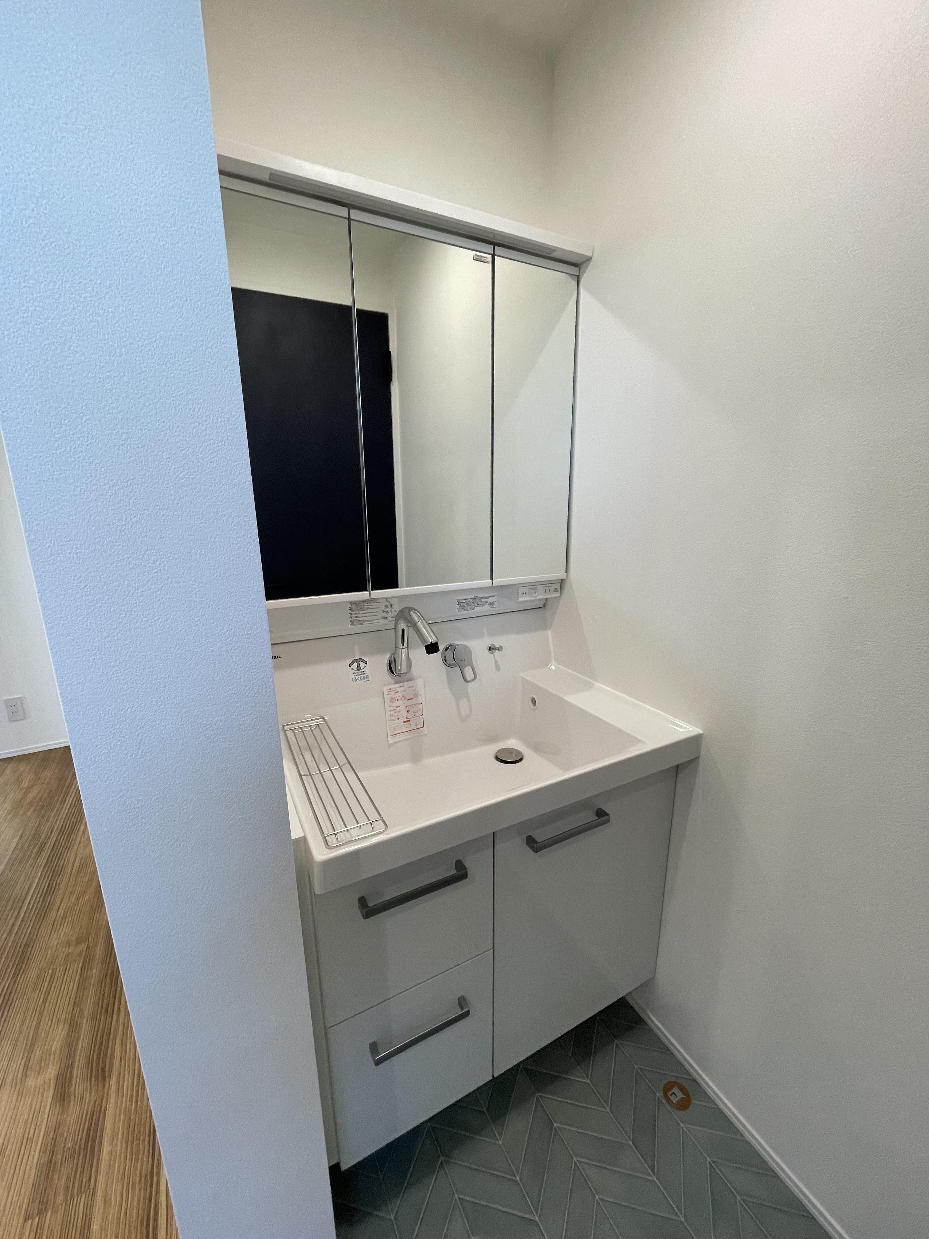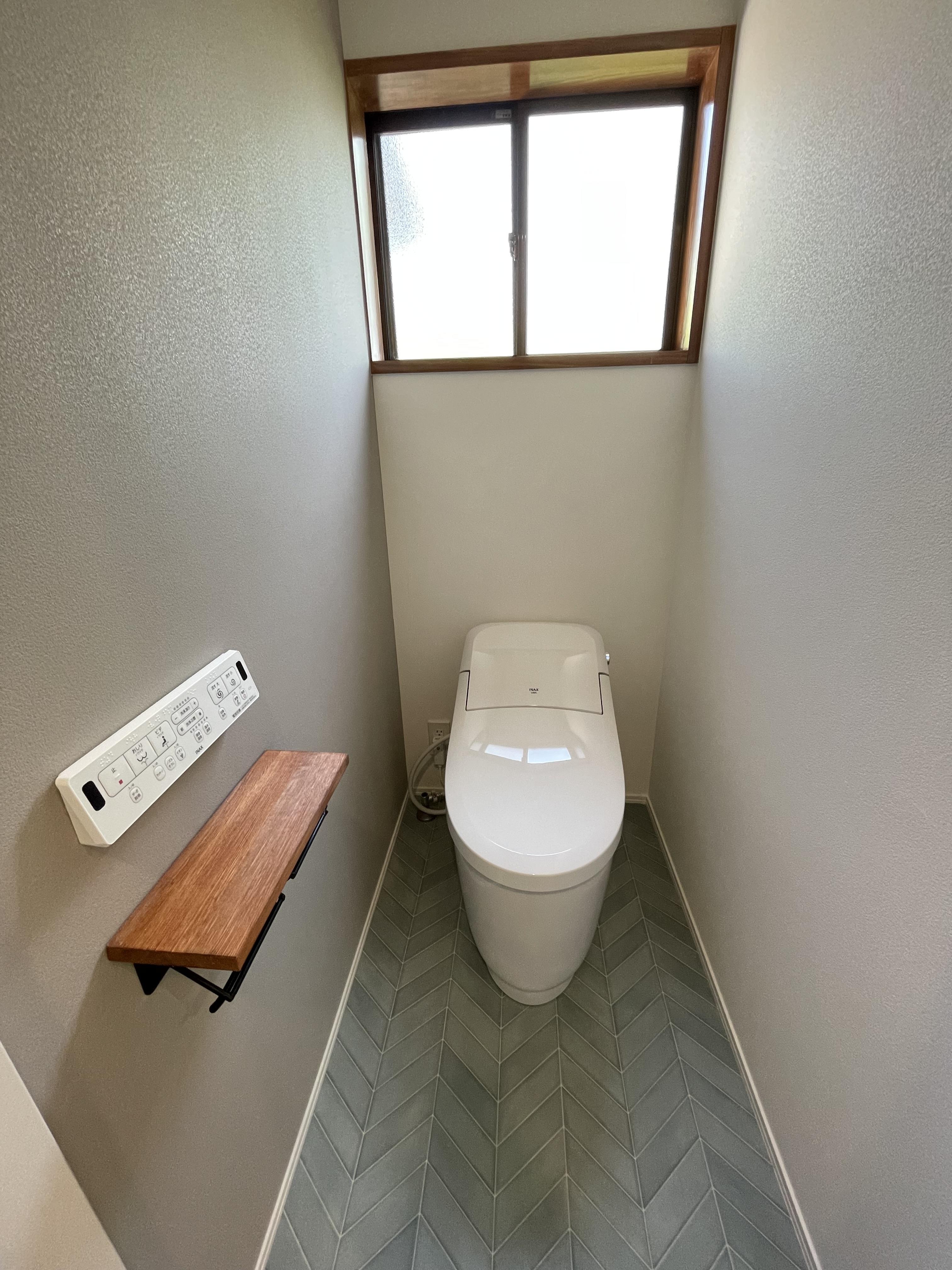 洗面化粧台とトイレも取替えてトイレのクッションフロアは人気のヘリンボーン状のタイル柄を採用。