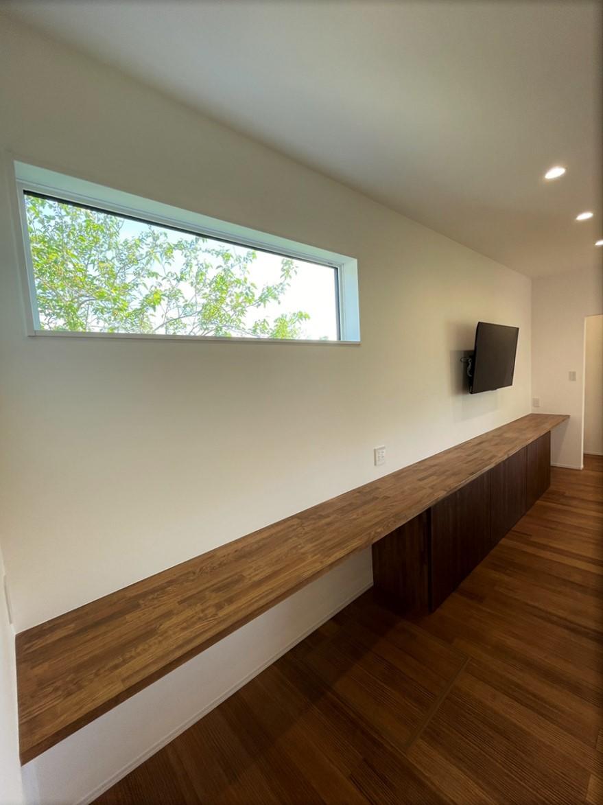 とても仲の良いご家族なので朝食は対面キッチンのカウンターで家族揃って食べれるようにゆっくりとした造りにして、夜は正面の壁掛けのテレビを見ながらご家族で寛げるよう間取りを替え、キッチンスペースとLDKを大きく広げました。奥様のご要望だった収納のアクセントの壁紙は大好きな黄色を採用し、お気に入りの収納スペースになったそうです。 どこにいてもお子様をうかがえて、これからのお子様の成長を見守りながら安心して暮らせるお住まいになりました。