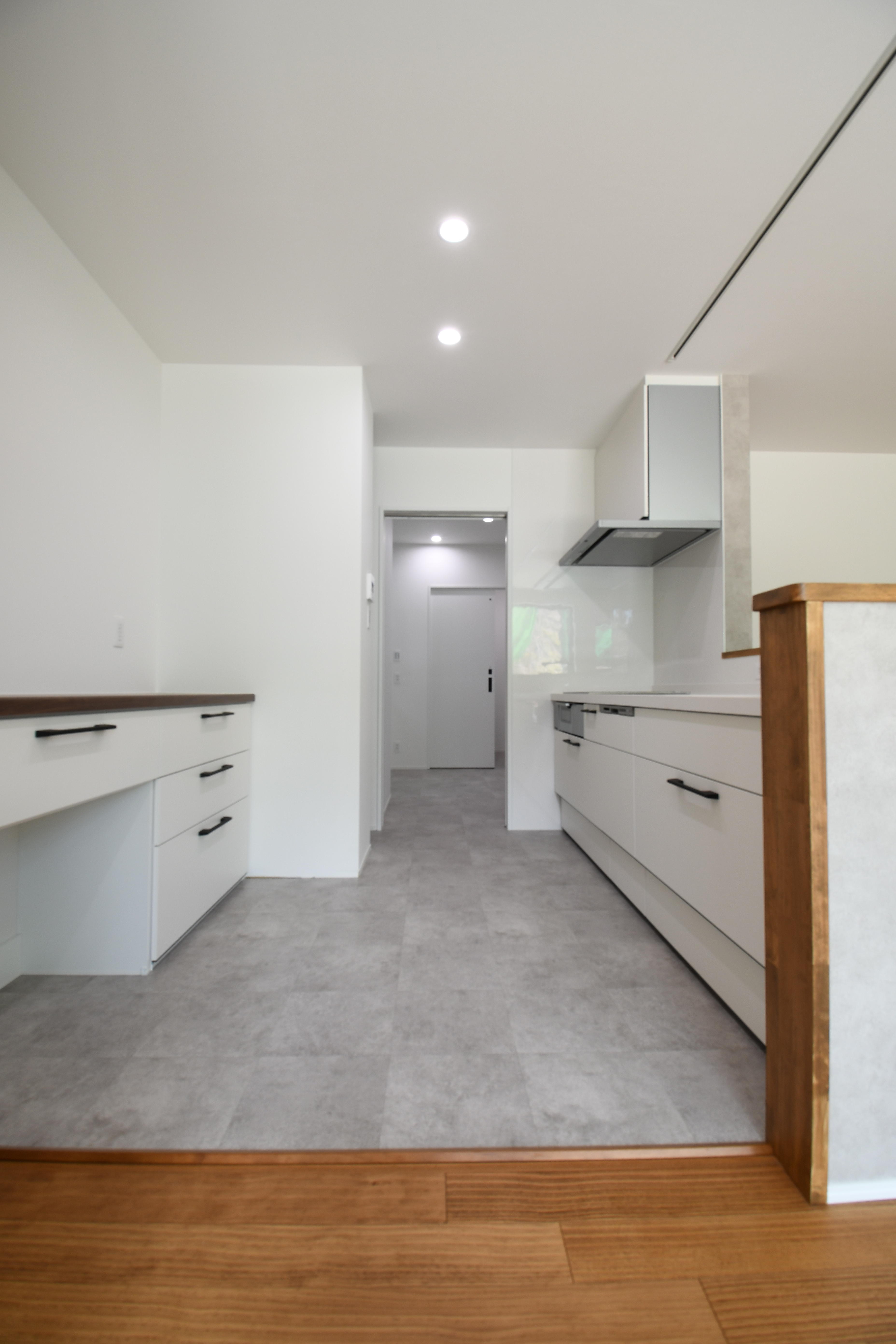 そこには子供たちがゴロリとくつろげる3畳ほどの小上がりの畳のスペースを確保して、キッチンから二人のお子様に目が行き届くよう対面キッチンに変更。
