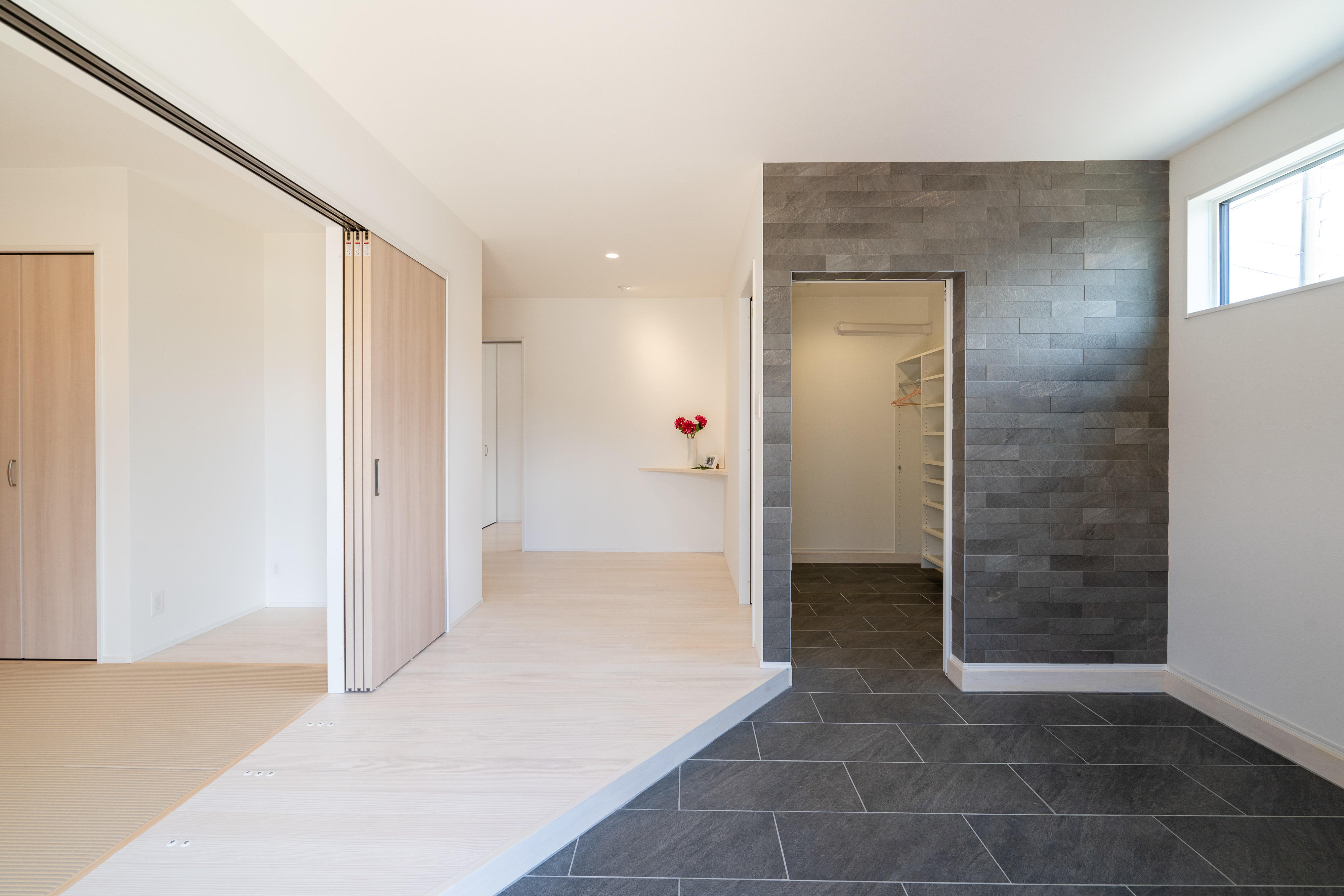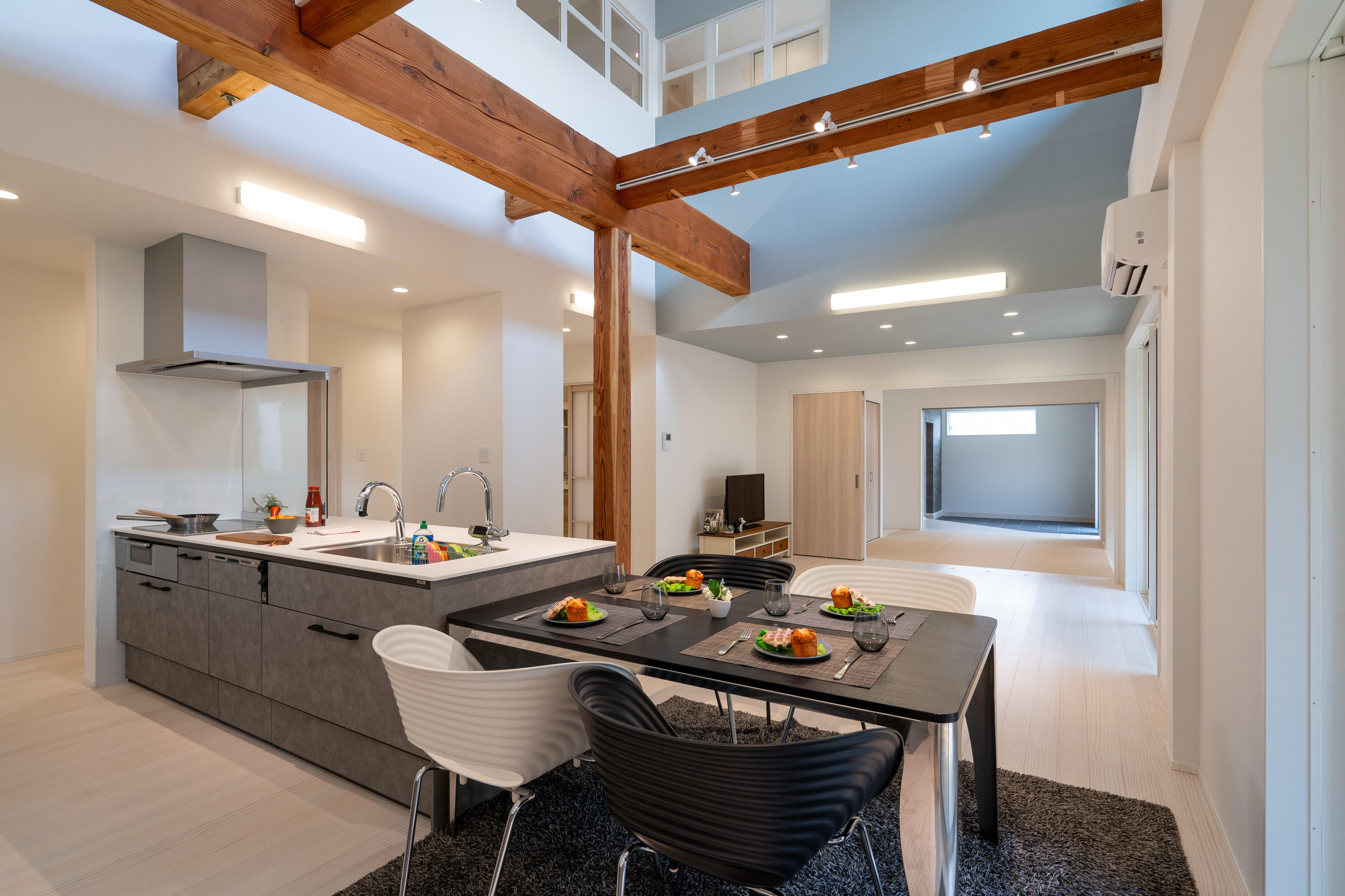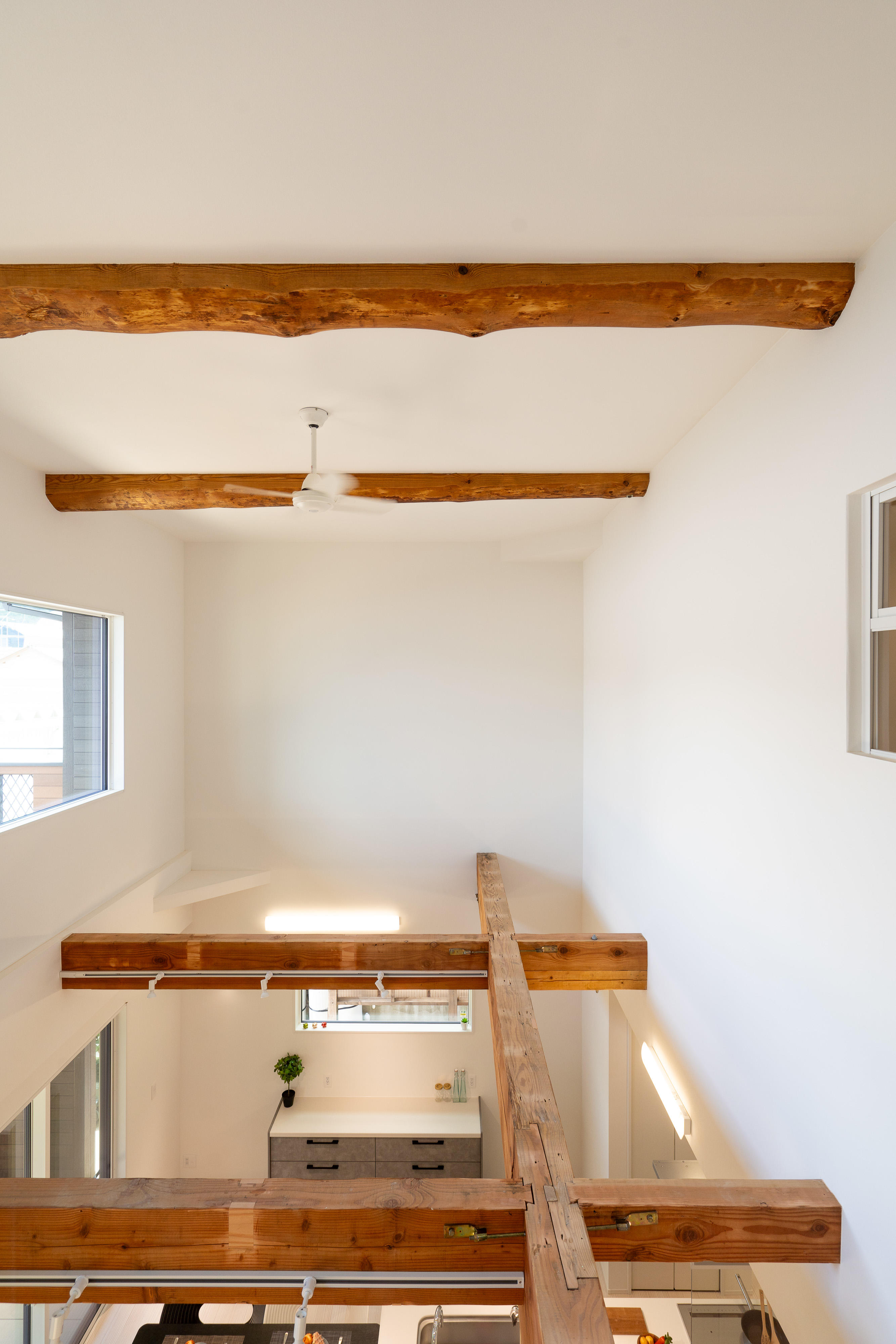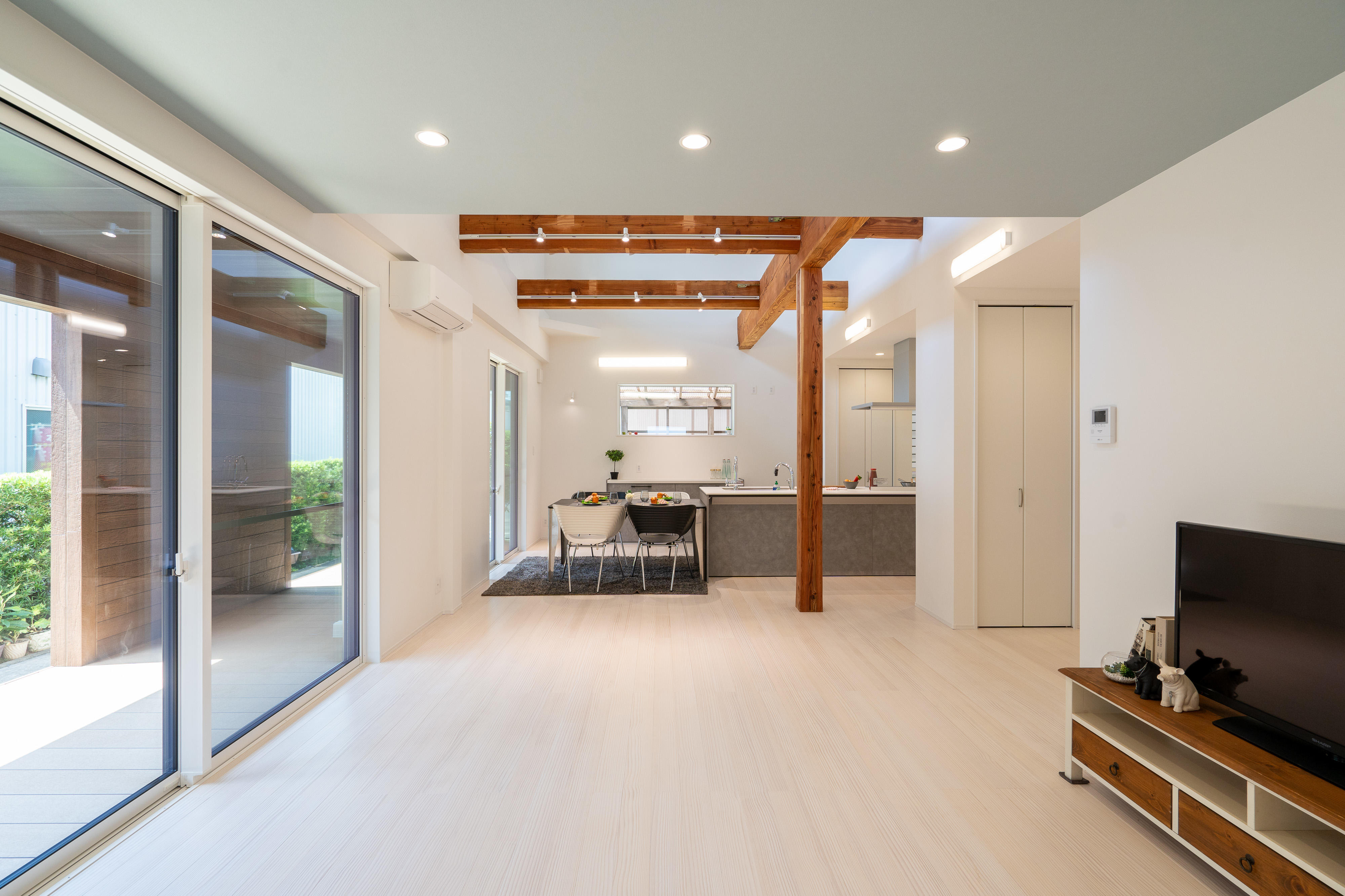 太い柱や梁、それを活かしてLDKを吹き抜けにして開放的で、さらに大きな窓から日差しがたっぷり入る明るい住まいへ。耐震補強で地震にも強くなり、サッシはトリプルガラスのTWを採用し、断熱性能もUPさせました。 全面的に白をベースとした内装にして、住設機器もハイグレードの商品を選択され、とても満足していただきました。 広々とした玄関も高めにFIX窓を設置し、外からの視線も遮り、奥には広いシューズクローゼット。エコカラットも玄関タイルに合わせてモダンで素敵な雰囲気になりました。 寝室の隣にはウオークインクローゼット、そして洗面脱衣室、お風呂までがスムーズな家事動線を実現しました。 休日にはご主人様もバイクガレージで楽しい時間が過ごせそうです。家族それぞれの要望を満たし、家族3人で楽しく快適、安全に暮らせるお家になりました。