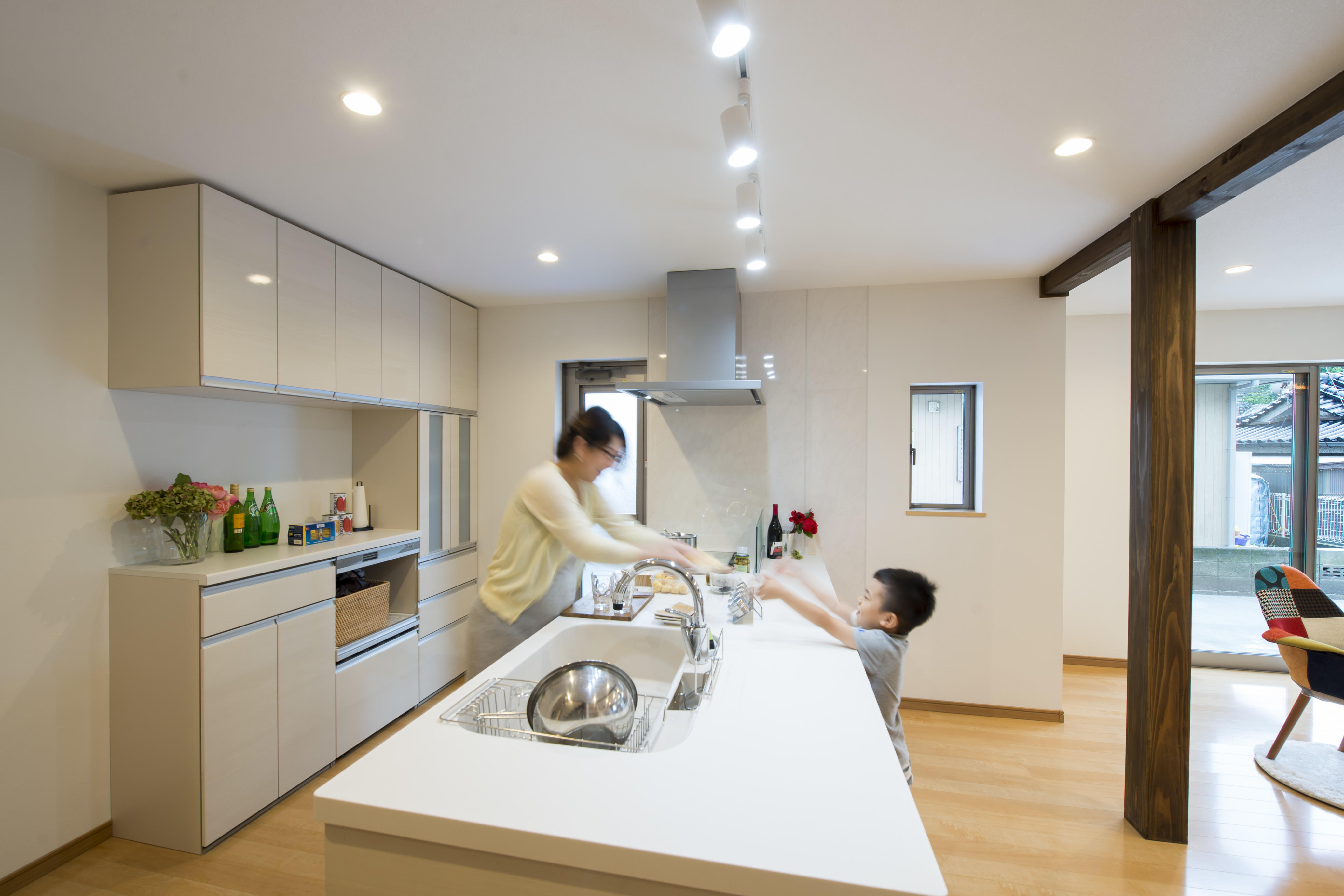 オープンな対面キッチンを採用。背面にシステムの収納を設置し吊戸棚がなくともスッキリ無駄なく収納ができます。お子様も進んでお手伝いができるようになったとか。