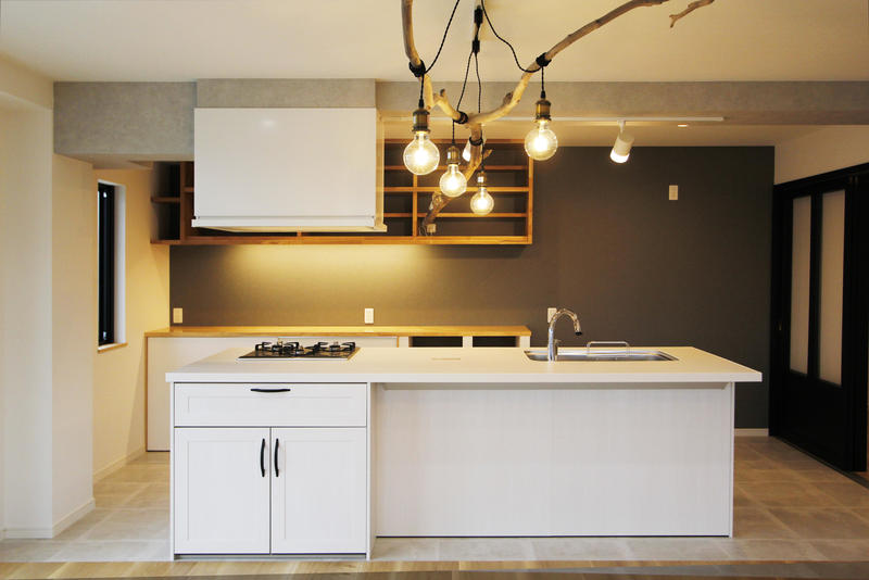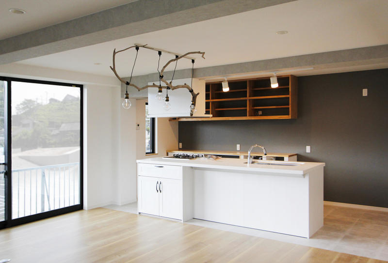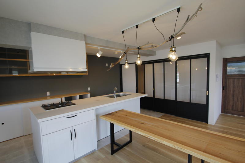 広々としたダイニングキッチンは動線が良い、アイランド型システムキッチンを採用。背面に造作の食器棚を作ることで収納力はバッチリです。キッチンとダイニングの床はフラットな造りで、掃除がしやすく、奥様の家事がしやすいキッチンとなりました。