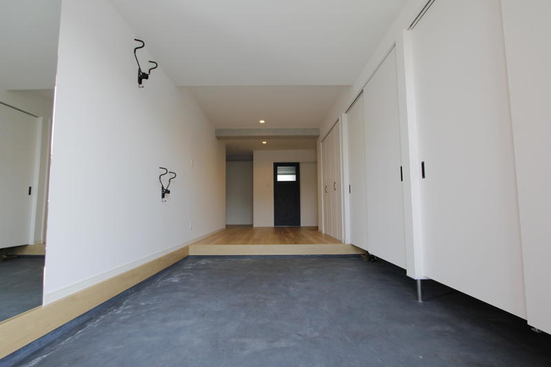 大きなシューズクロークは収納力抜群。靴以外にも掃除用具やお施主さまのご趣味であるロードバイクの整備機材もばっちり入ります。またロードバイクが壁に掛けられるよう、バイクスタンドを取り付けました。