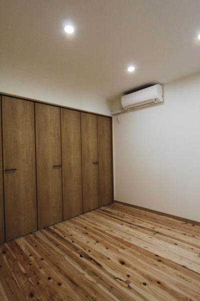 無垢の杉床がお部屋のアクセント。奥行きが90㎝ありますのでご夫婦の荷物が十分に入る大容量のクローゼットです。