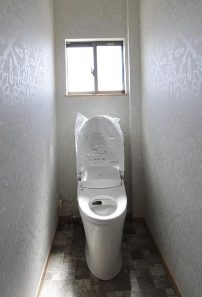 アクアセラミック製のトイレは汚れにくく、また便器のフチがないためお手入れ簡単。タイル調の床と天井・壁のクロスは白地にロココ調柄の落ち着いたかわいらしさのトイレ室です。