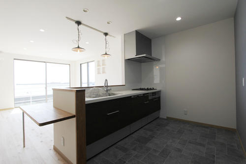 L字に造作カウンターを取り付け、食事をとれるように。キッチンはLIXILのアレスタを採用。水栓金具はお施主様こだわりのグローエのスタイリッシュなデザイン。床には水や傷に強いフロアタイルを使用。海を眺めながら料理ができるキッチンになりました。よごれんフードや食洗器付きで家事が楽になりました。