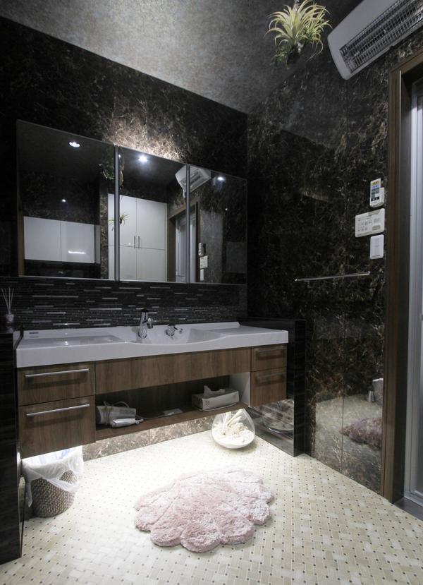 洗面台と窓の間にはモザイクタイルを貼り、室内壁には光沢があるパネルを貼り重厚感を。