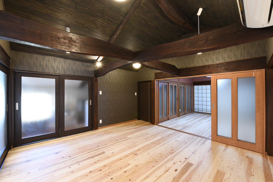弊社完成見学会にご覧頂いたのがきっかけとなり、今回施工させて頂きました。 昔ながらの古民家特有の梁、桁を活かし、勾配天井を施し室内の空間を醸し出すことができました。 特に内部建具とクロス仕様、杉の床といった床・壁・天井のコントラストと照明に苦慮致しました。