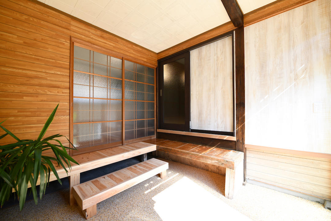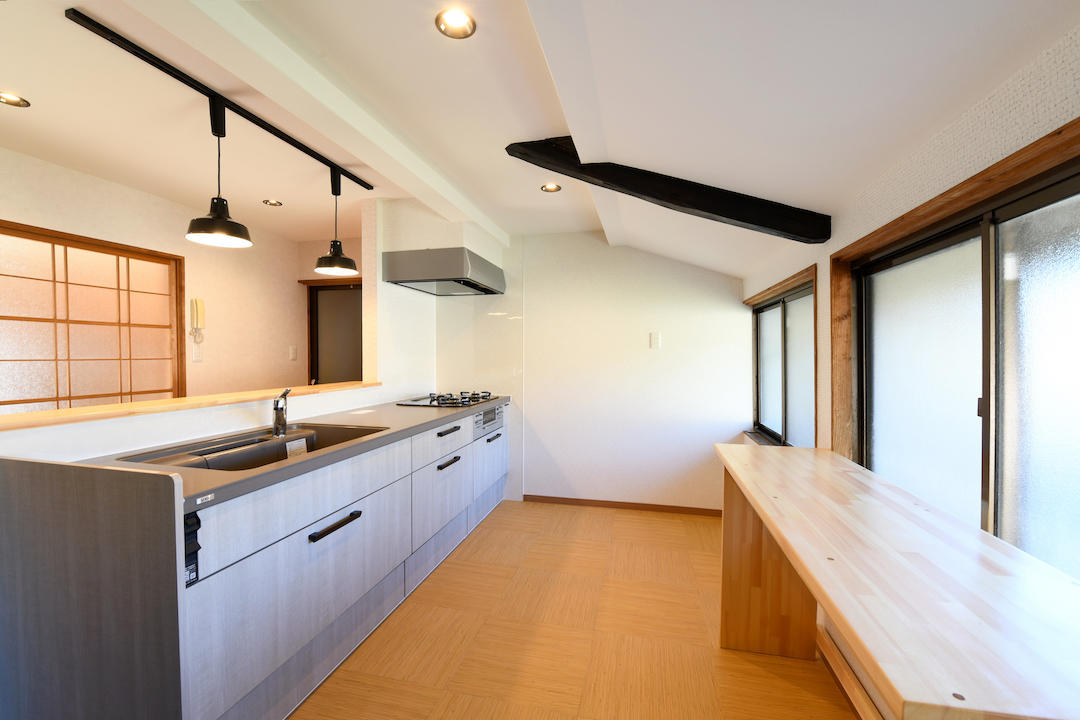 築50年以上の古民家をモダンにリノベーション。 低い天井を取り払って長く使われて風合いのある梁を表ました。 勾配天井には杉板を貼り、重厚感ある内装に仕上げました。