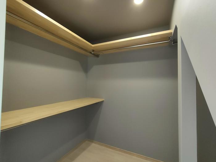 階段下部分も含めて約3帖のファミリークローゼットを造作。吊り下げ収納はコートなどの長いものや、ジャケットなどの短いもの、キャリーケースなどの大きなものも置けるようになりました。