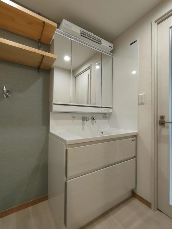 タカラスタンダードの洗面を施工。収納部分がホーローでできているのでキレイが長続き。また洗面横のパネルもホーロー製なので磁石がくっつき、マグネット収納やタオル掛けをくっつけることができます。