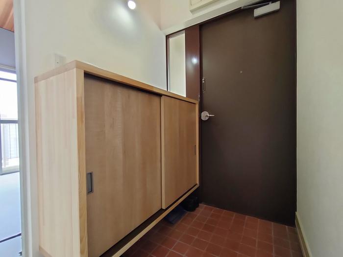 元々靴箱がなかったお家でした。動線に干渉しないよう造作で靴箱を施工しました。
