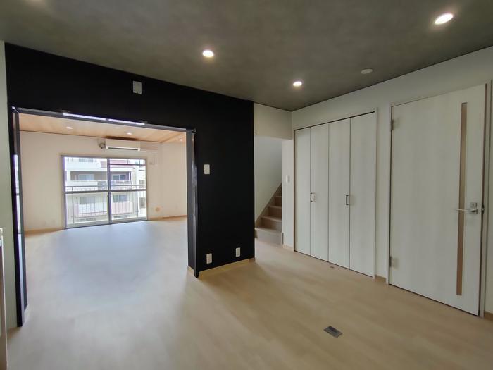 中古マンションを購入し、リフォームして頂きました。 開放的な広いリビングを希望されていましたので、台所・和室・今・廊下の壁を取り払い、広く繋げました。 また収納スペースの効率を上げるために、床の間・押し入れだった場所にデスクワークスペースを設け、他の押し入れ等も何を収納するのか打合せをしたうえで、クローゼット収納にリフォームいたしました。 築40年を超えていたため、内装も全面貼り替えました。 壁紙の色はお施主様が楽しそうにお選びになり、お引き渡しの際 「この色は正解だった!すごくかわいい!」 と喜んで頂けた奥様がとても印象的で、私も嬉しかったです。