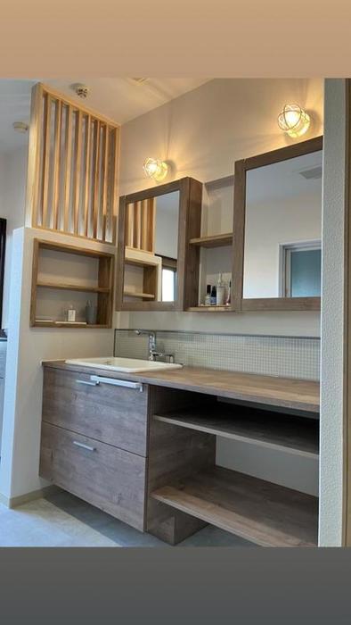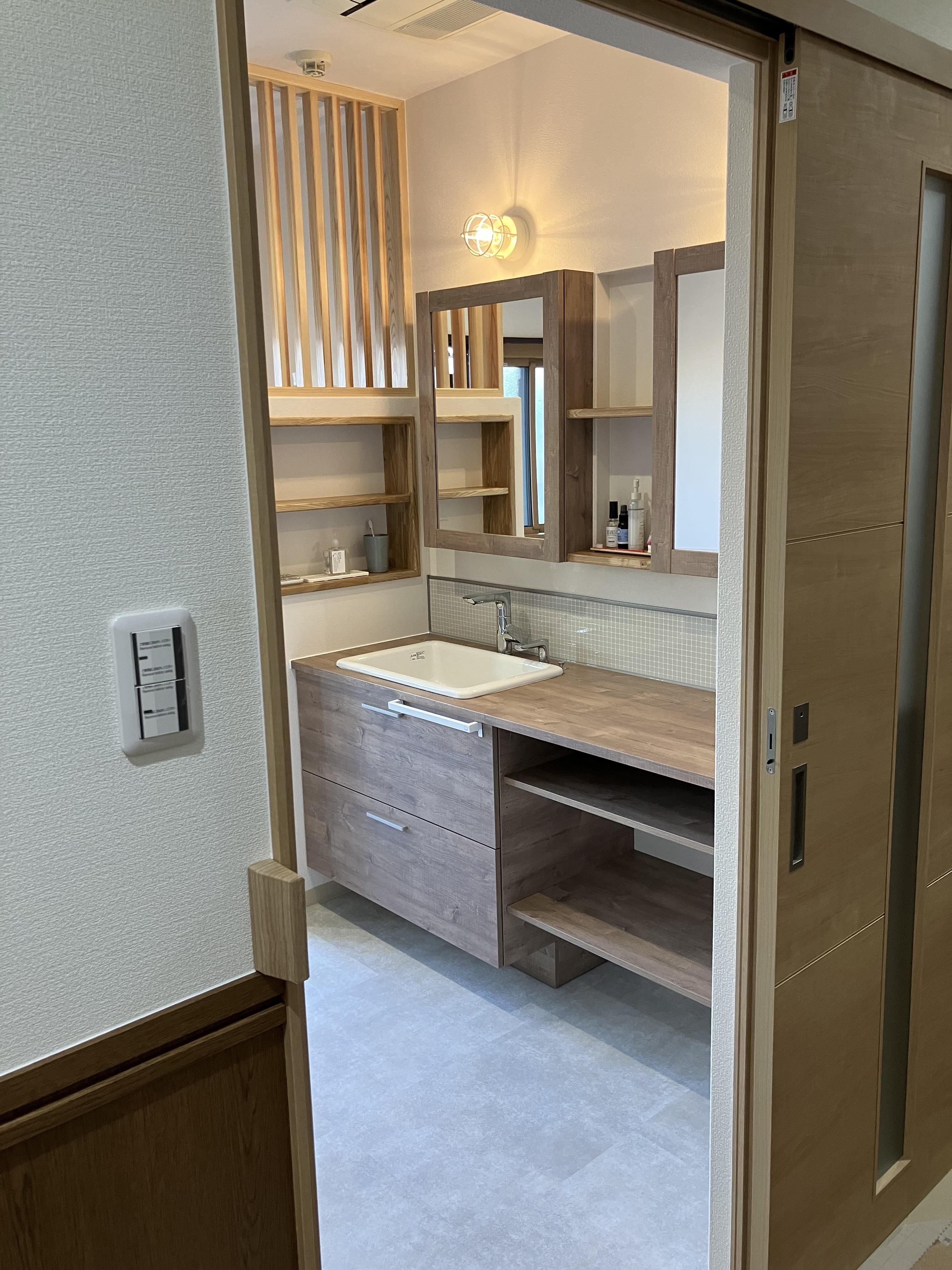 この度は洗面室改装工事ご提案させて頂き誠に有難う御座いました。 洗面室が寒い~収納~デザイン性を重視し綿密にお打合せ致しました。工事工程の中で細部にわたりご確認の上完成致しました。 職人のひと手間が各所に施され完成度がましました。 インテリアカウンター・広ふかボウル・きれい除菌水・大きな一面境収納と造作棚の収納力が高まりました。