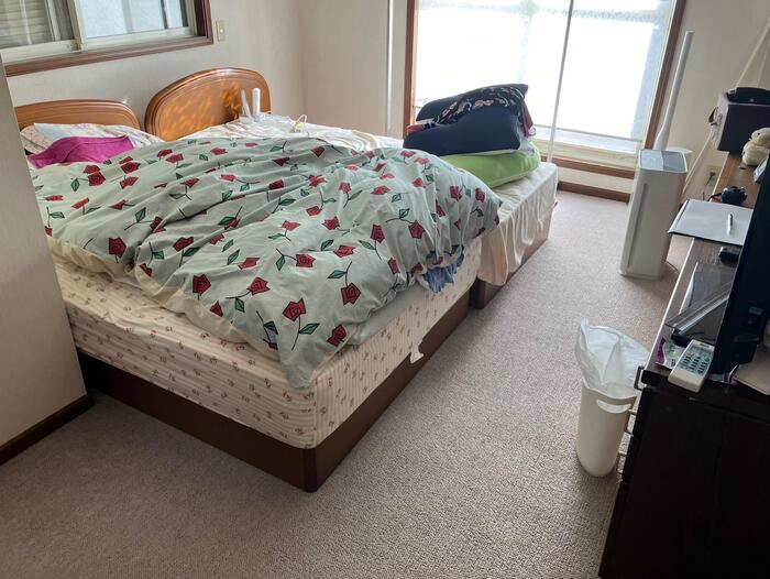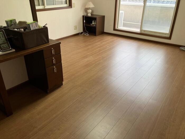 寝室の絨毯をひいていた床をフロア材の床へとリフォームさせて頂きました。床材のカラーはお施主様自身のご要望に合わせ、室内で使用しているフロアーと同じ色合いのものを使用させて頂きました。