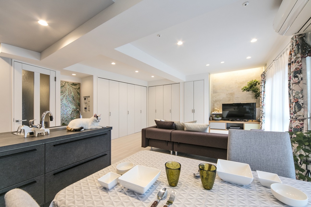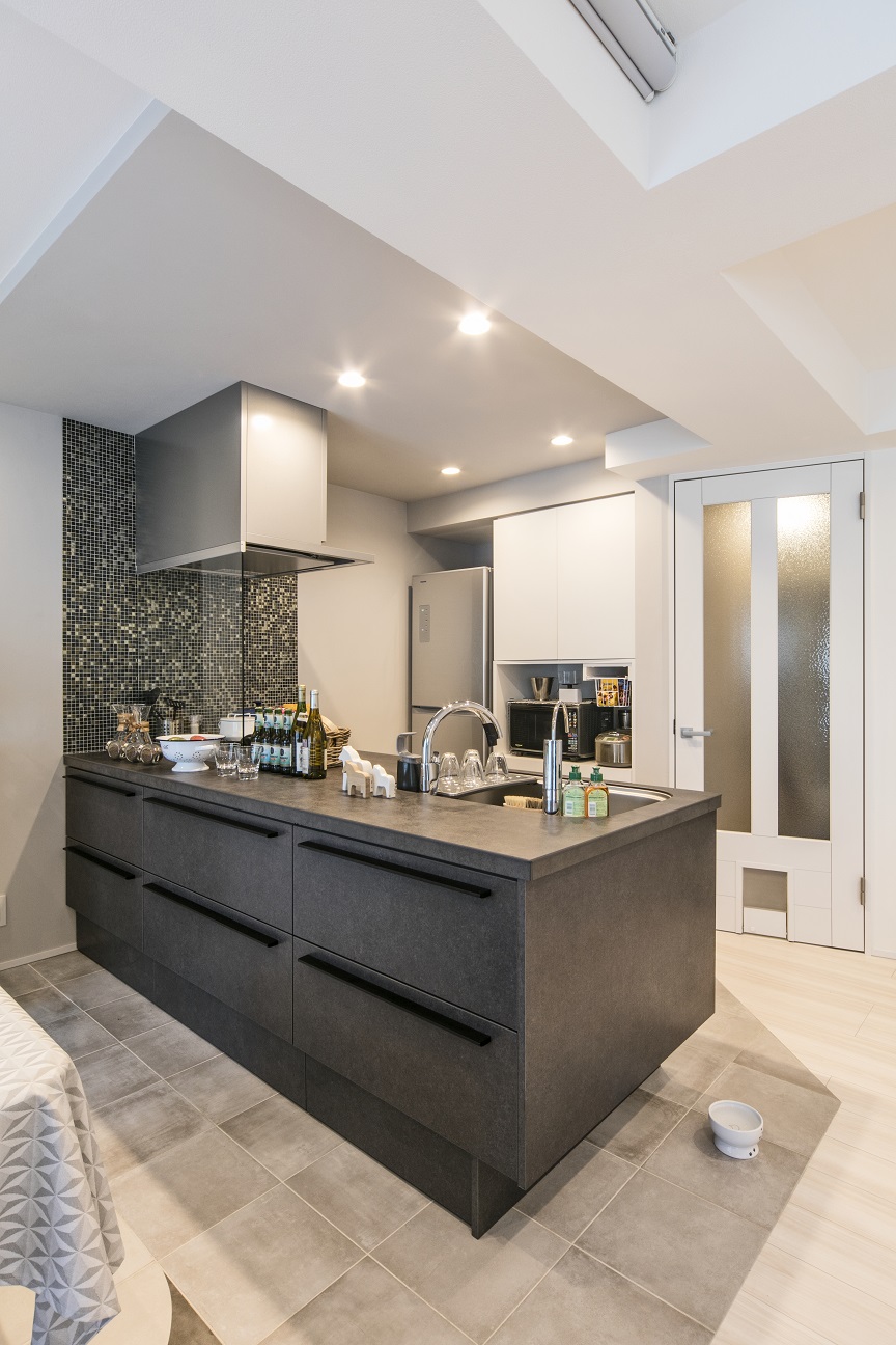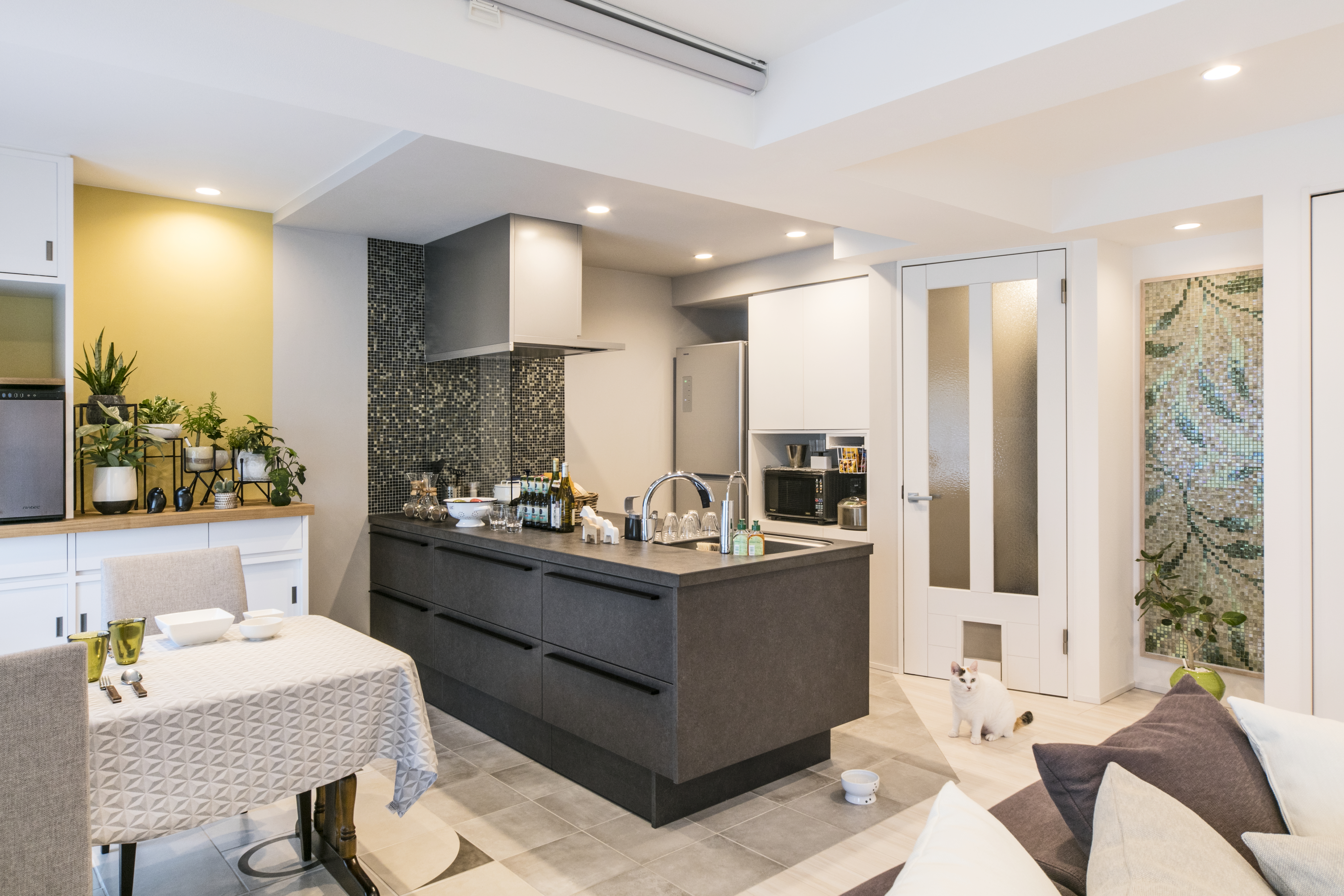 LDKの改装は奥様のこだわりがつまりにつまっています。 目に見える内装のデザインはもちろん、収納に関しては、内部の棚構成の細かいところまでこだわりをお持ちでした。 『よくある在り来たりのリフォームは嫌』というお言葉をプランニングの際は常に意識をしていました。 お客様の世界観が凝縮されています。