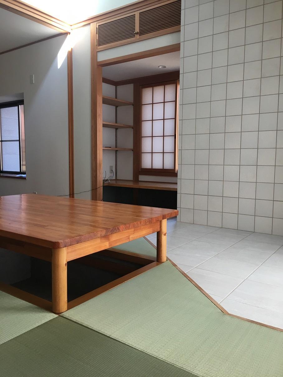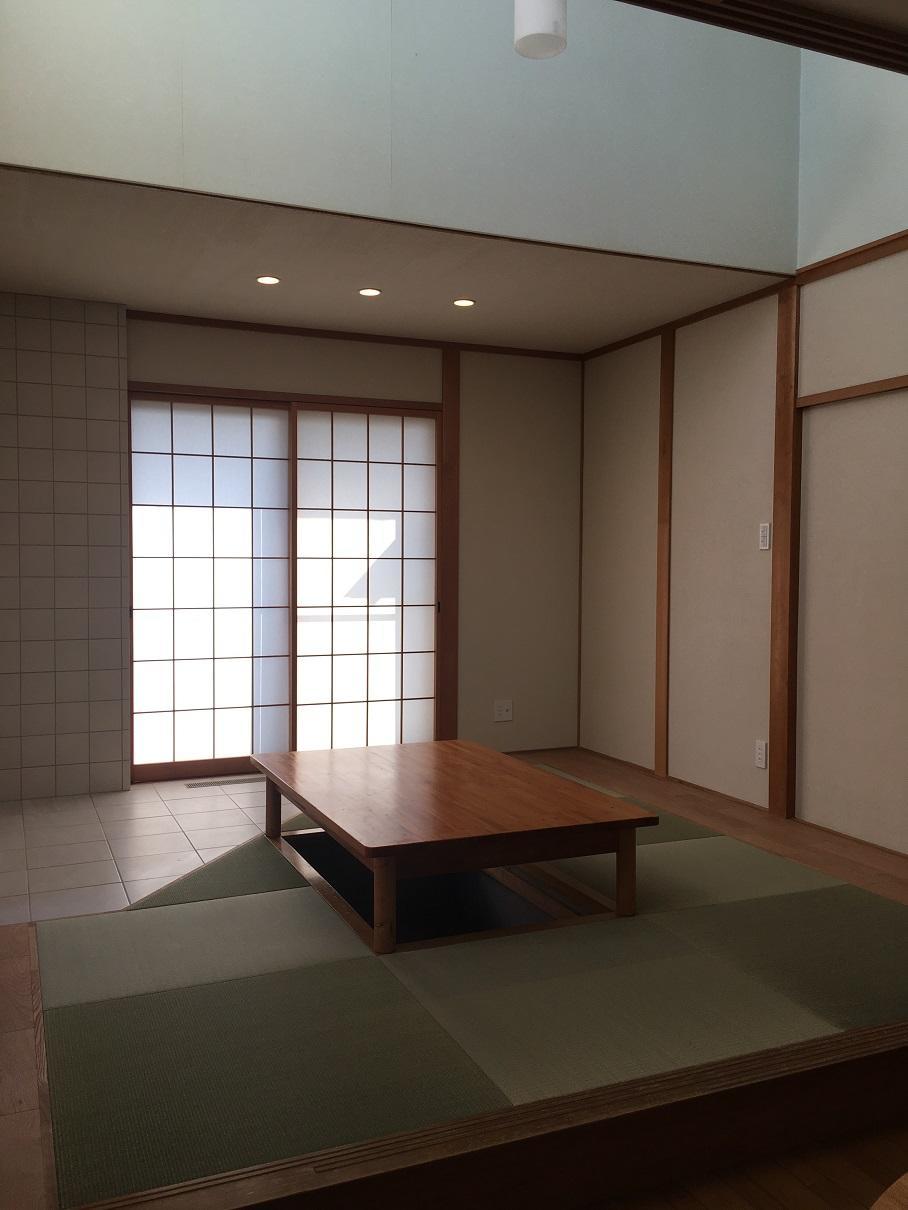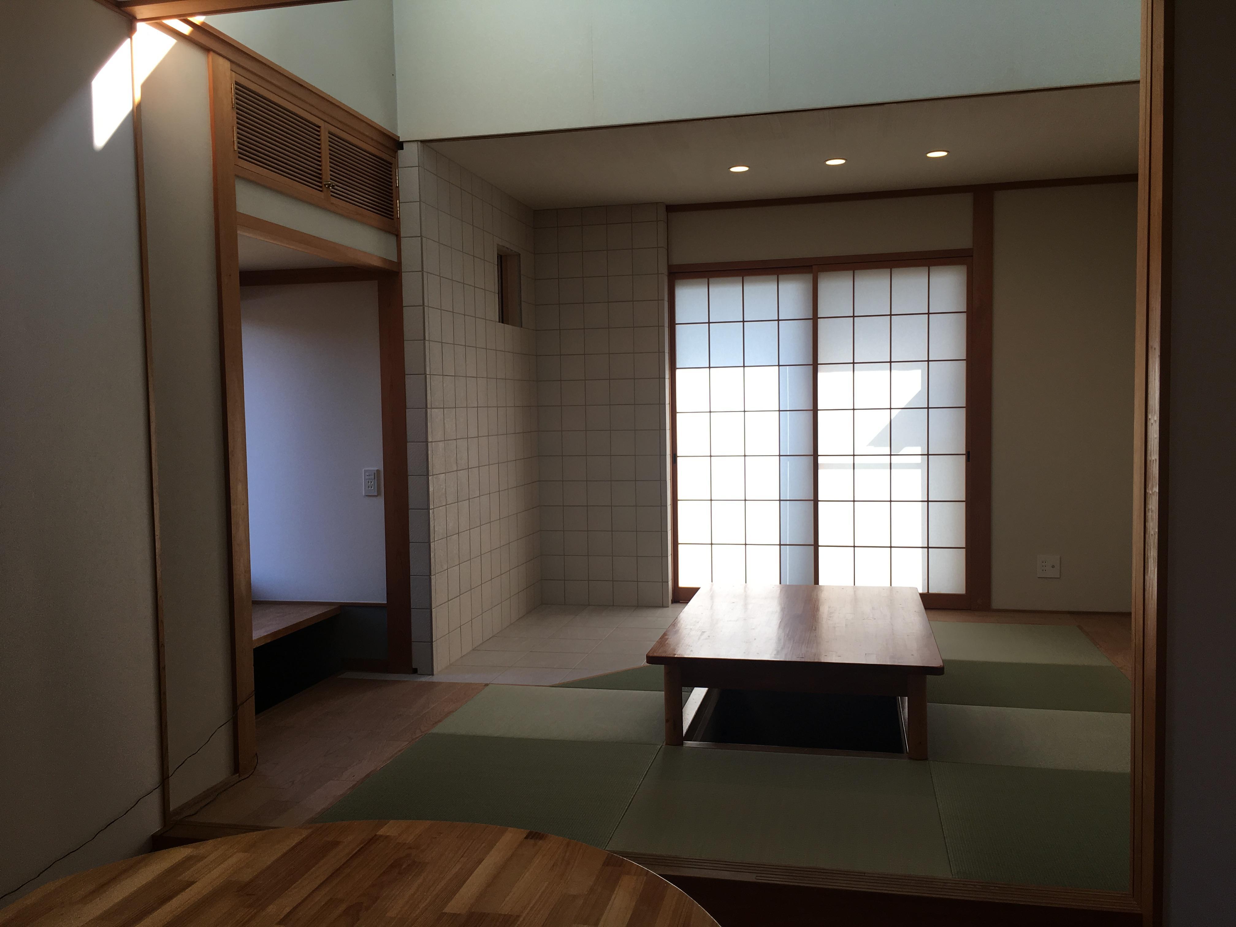 あくまでも薪ストーブがメインとなるような、控えめだけどシンプルすぎないタイルが私もお気に入りです。キッチン垂れ壁も解体させていただき、キッチンからダイニング、居間である小上がりの畳が見渡せ、お子様がお勉強する姿、遊ぶ姿が常に見守れます。いつも仲良しなご家族にピッタリな間取りになりました。 工事した年は春になったので、薪ストーブの設置が見れてません。薪ストーブを設置した和室も楽しみです。