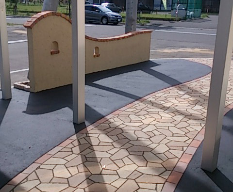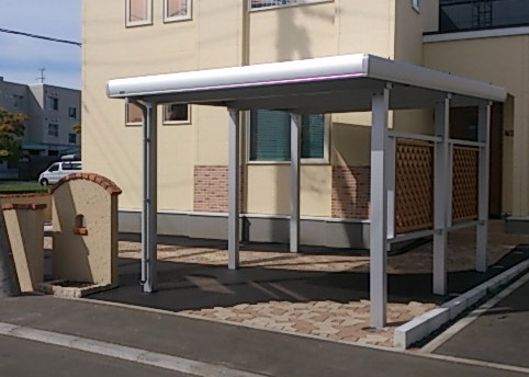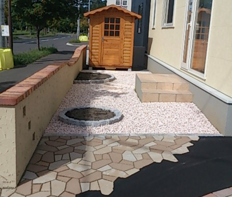 駐車スペースと玄関アプローチを建物に合わせて可愛らしく