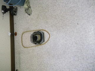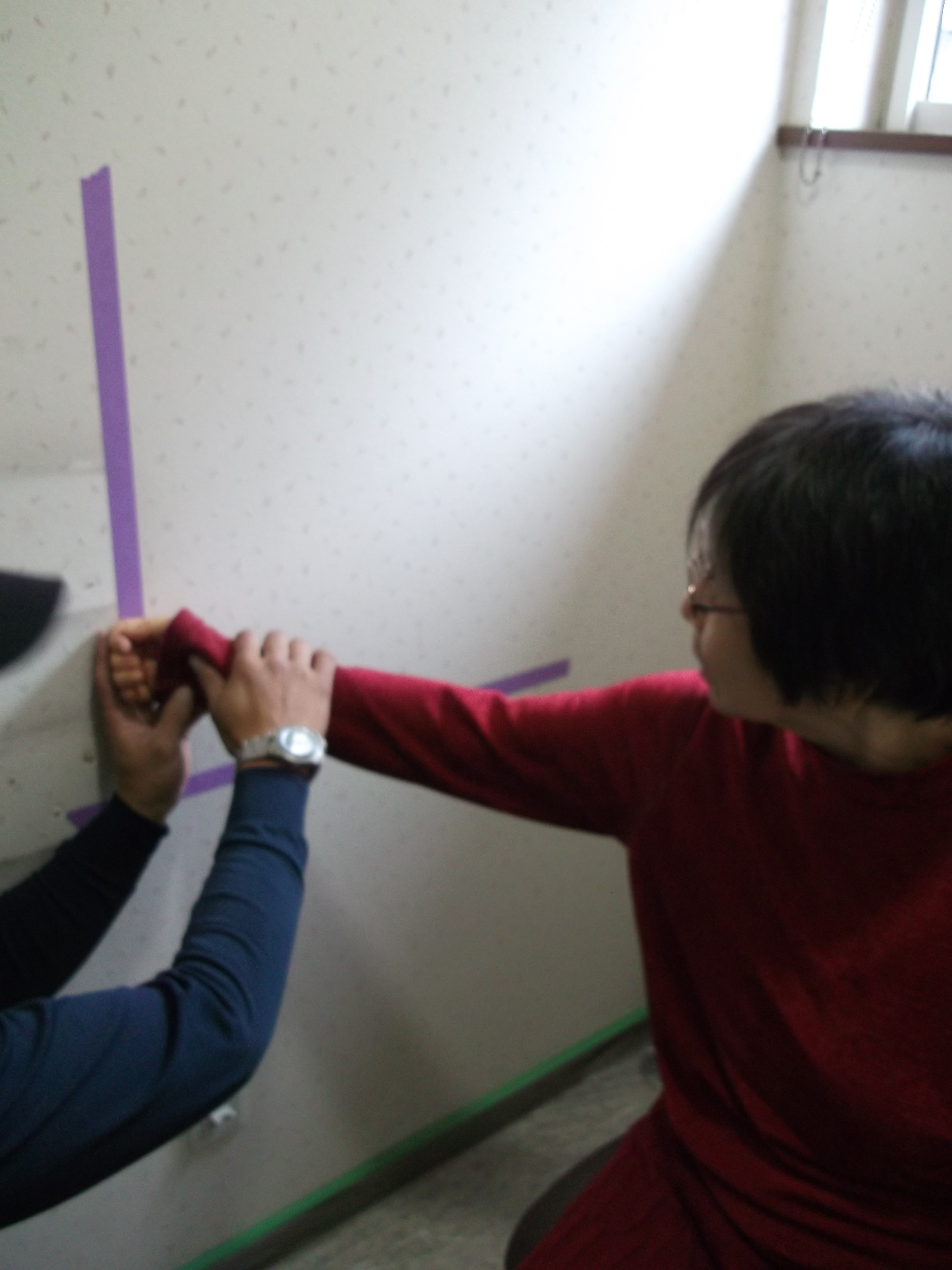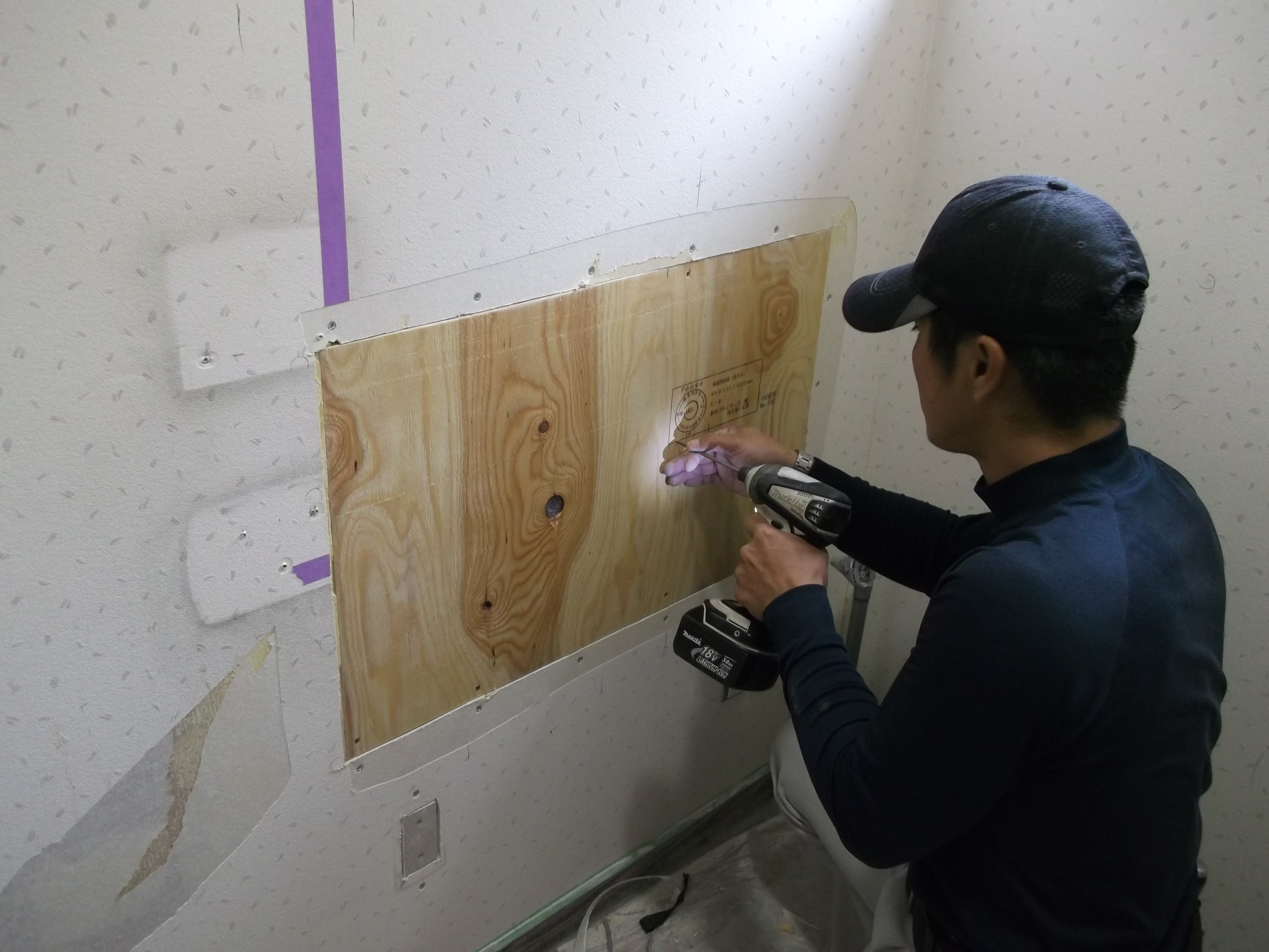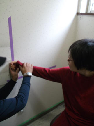 新トイレ取り付け予定の位置に椅子を置き、実際にお母様に座っていただいて、手すり取り付け位置を打ち合わせしました。