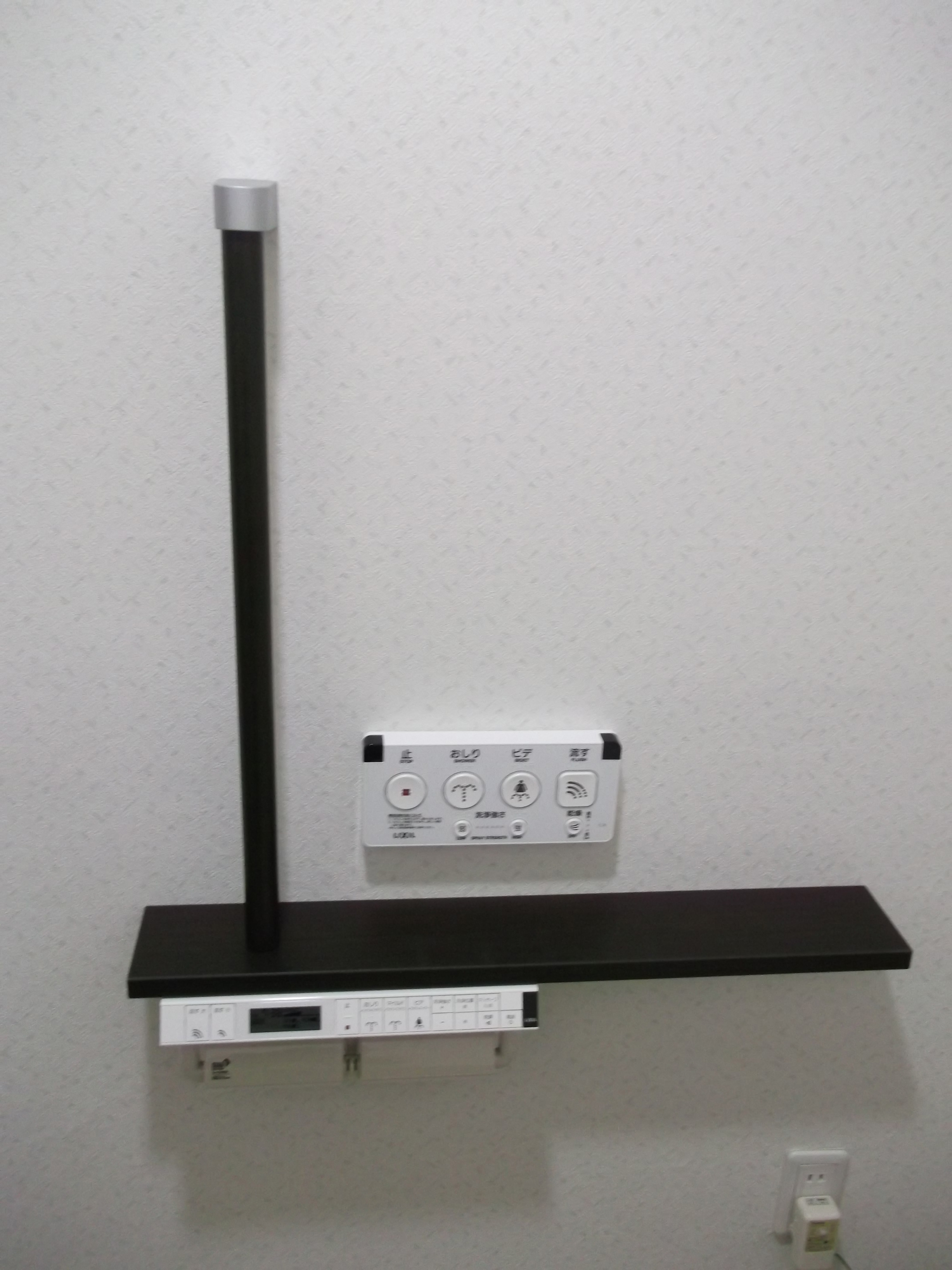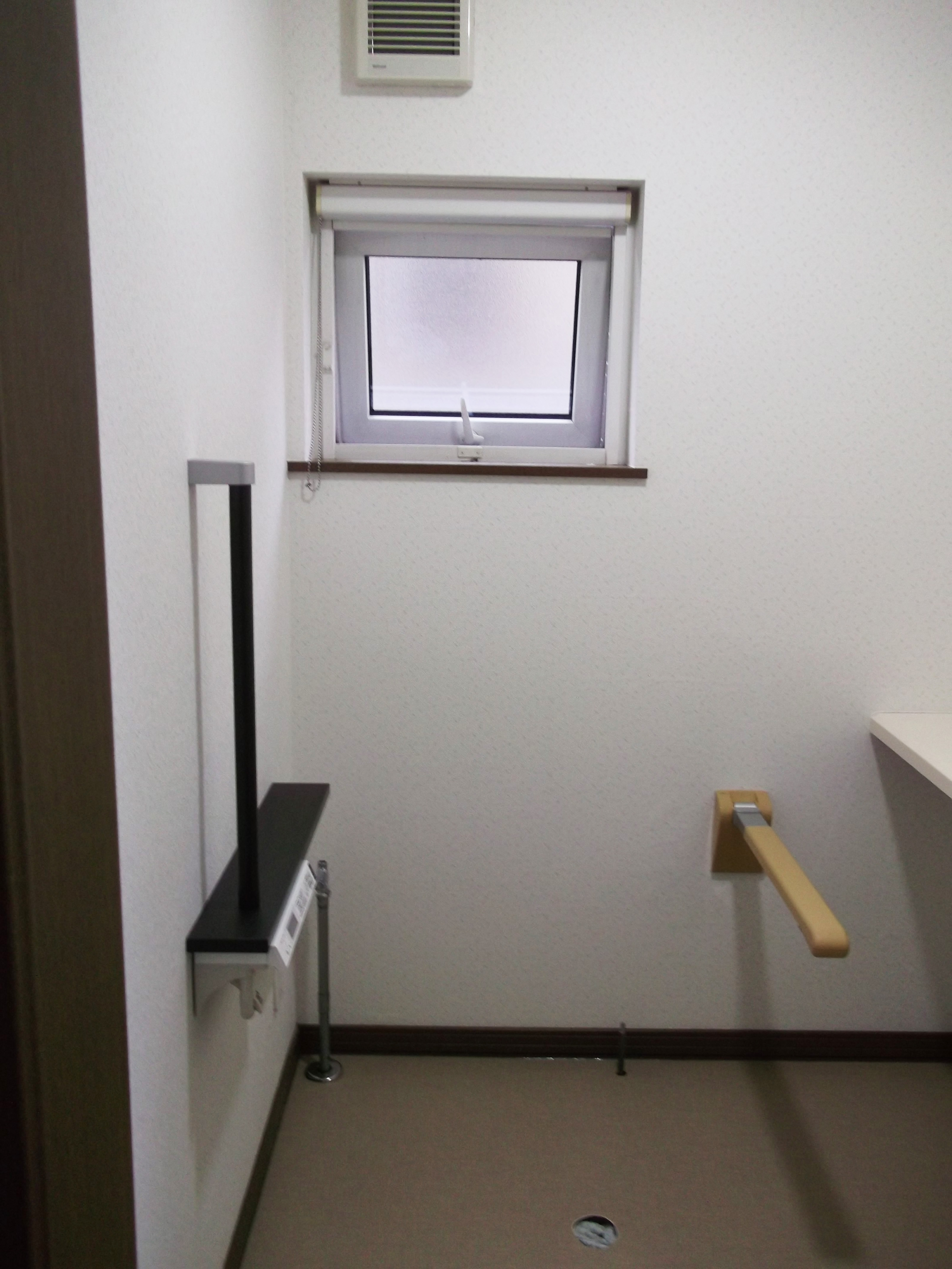 壁のクロス・床のクッションフロアの貼り替え後、棚手すりとはねあげ式手すりを取り付けました。はねあげ式手すりは、介助の時などははね上げておくことができ便利です。