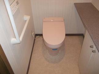トイレAFTER。タンクレスのLIXIL『サティス』はスッキリとしたデザイン。トイレ内がとても広く感じられます。カラーはピンクをお選びいただき、可愛らしく華やかに!