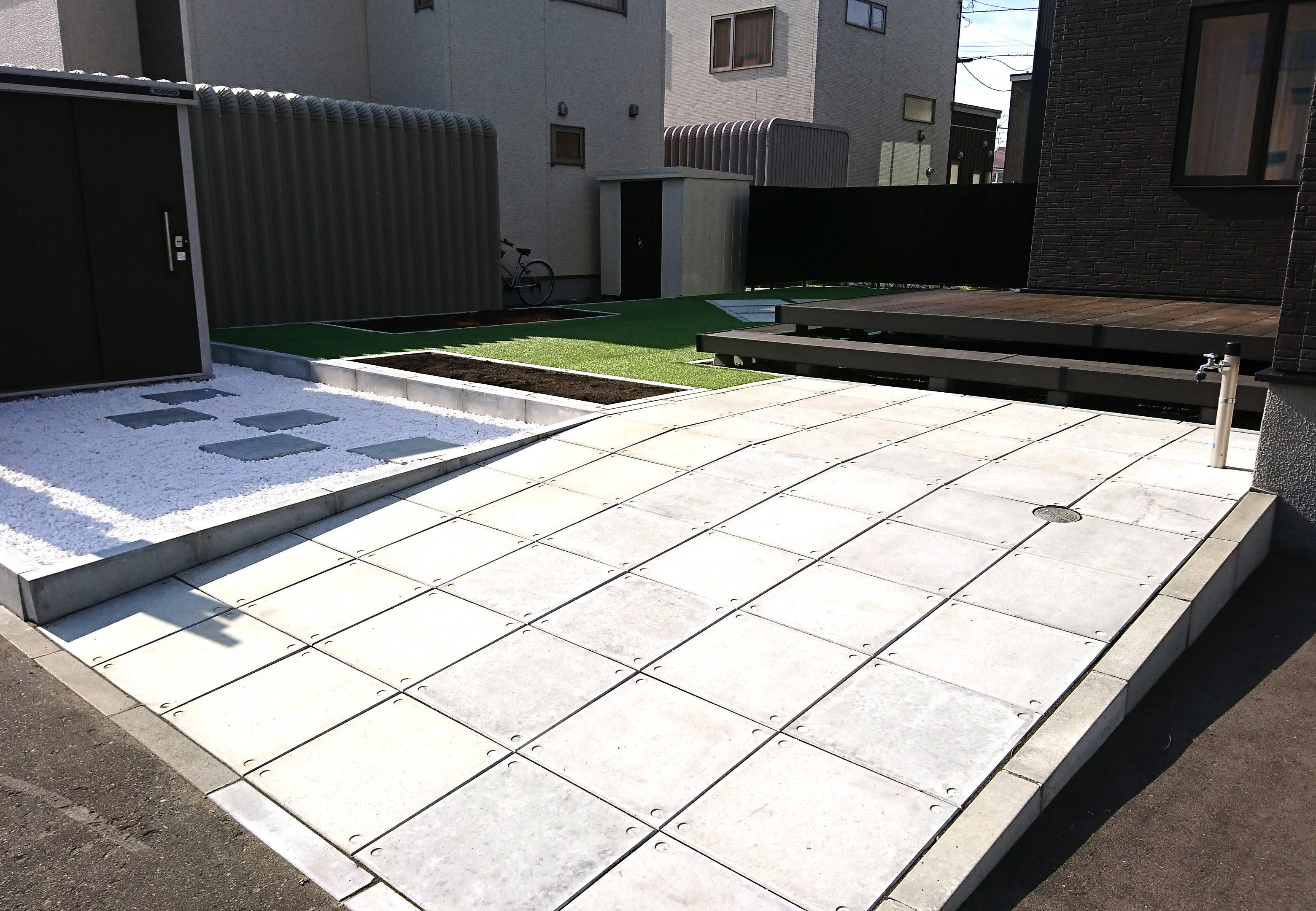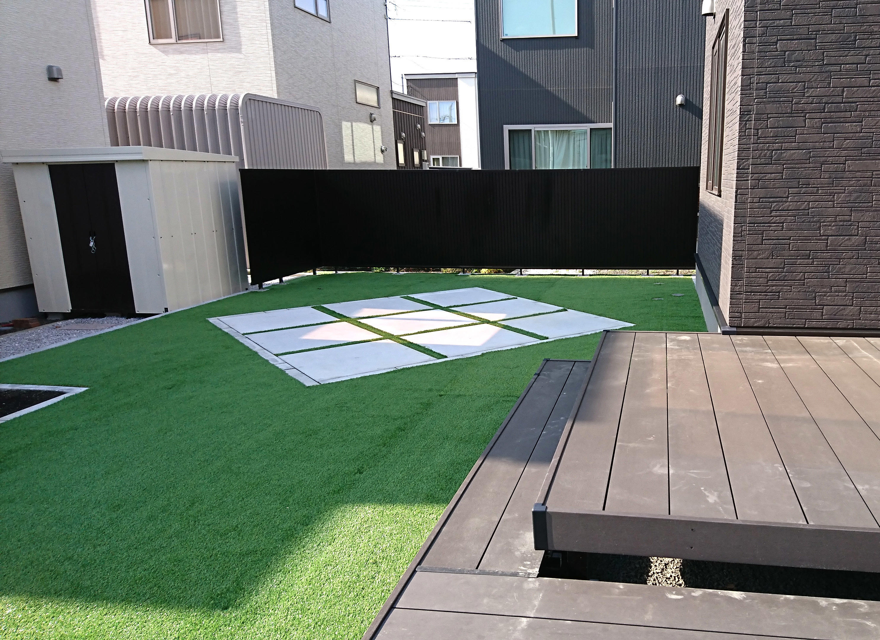 広いお庭を有効活用したガーデンスペースは、スタイリッシュなコンクリート平板と人工芝でデザインされたオシャレな空間