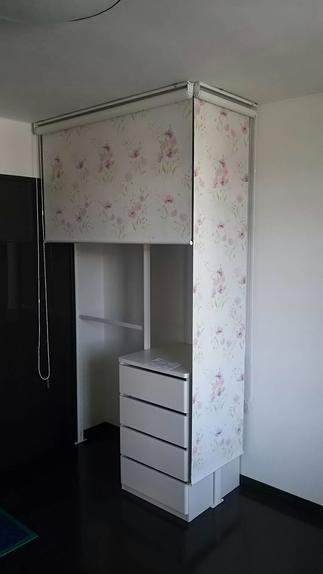 AFTER:反対側の壁面には洋服が収納できる『大建工業リラクロ』。花柄のロールカーテンで目隠しも可能。とても可愛らしい収納になりました。