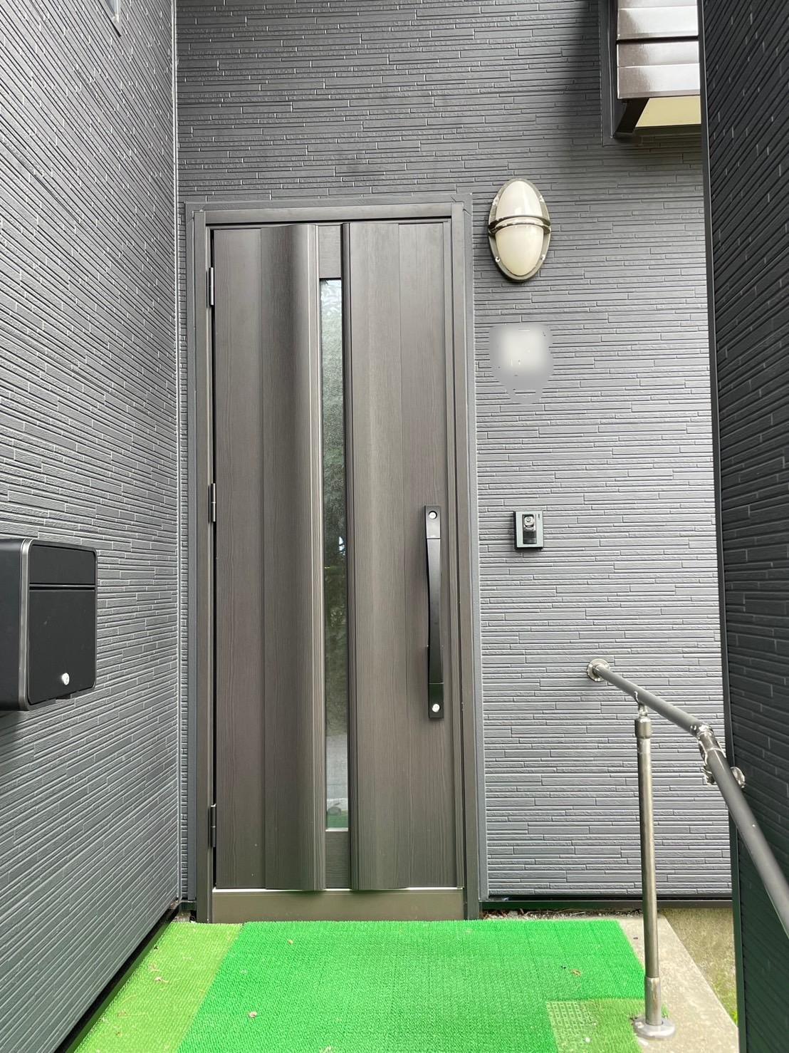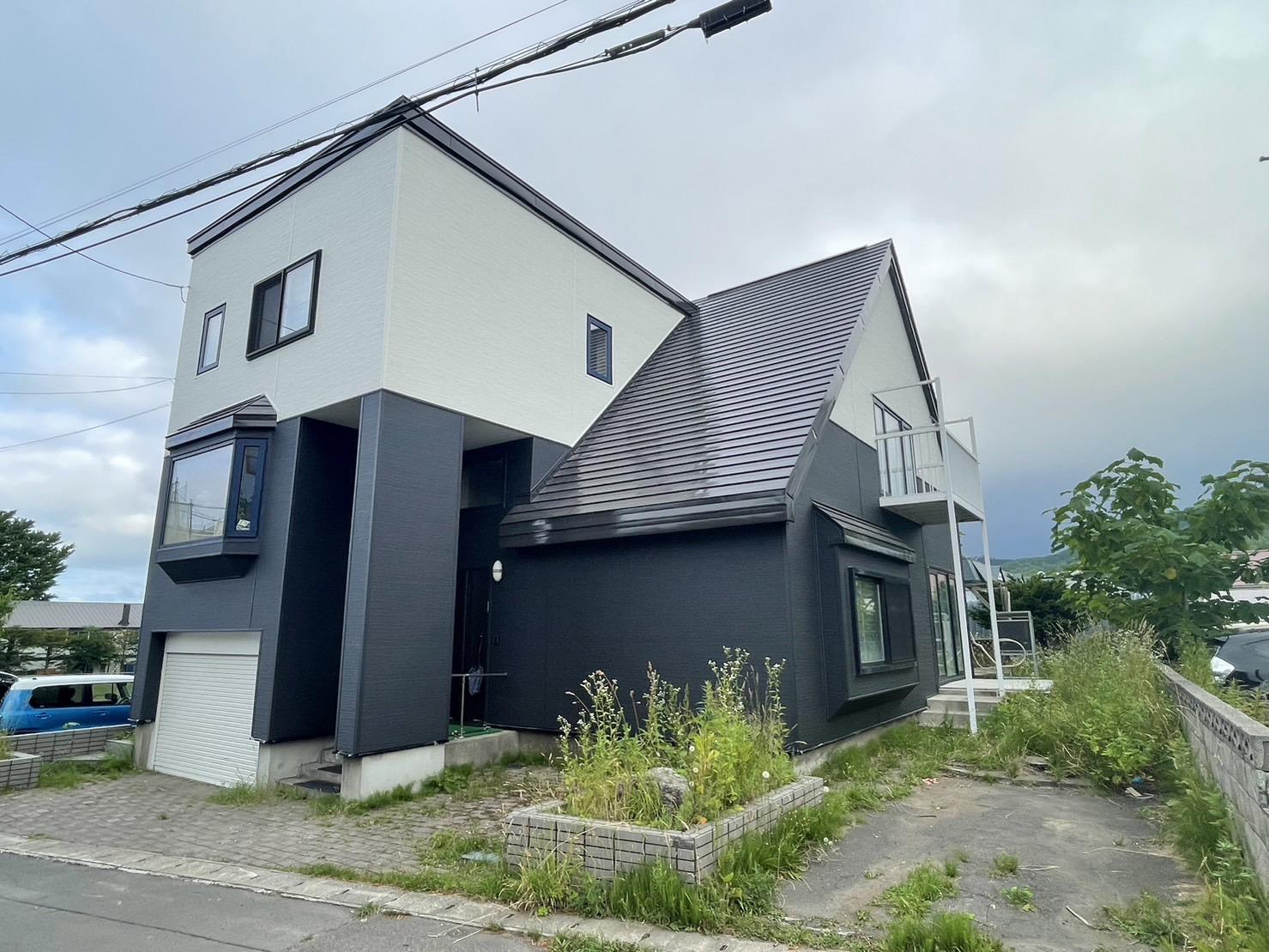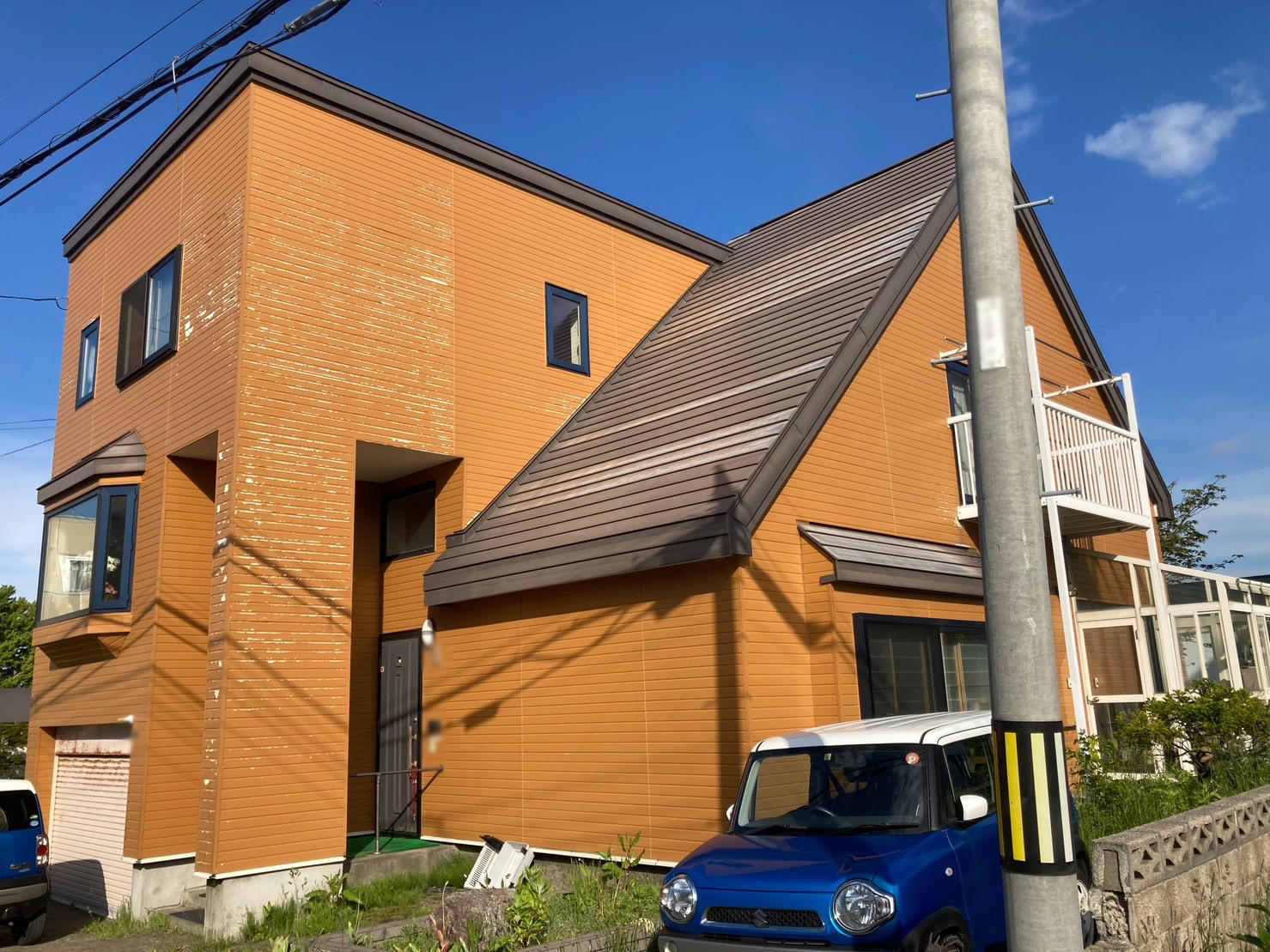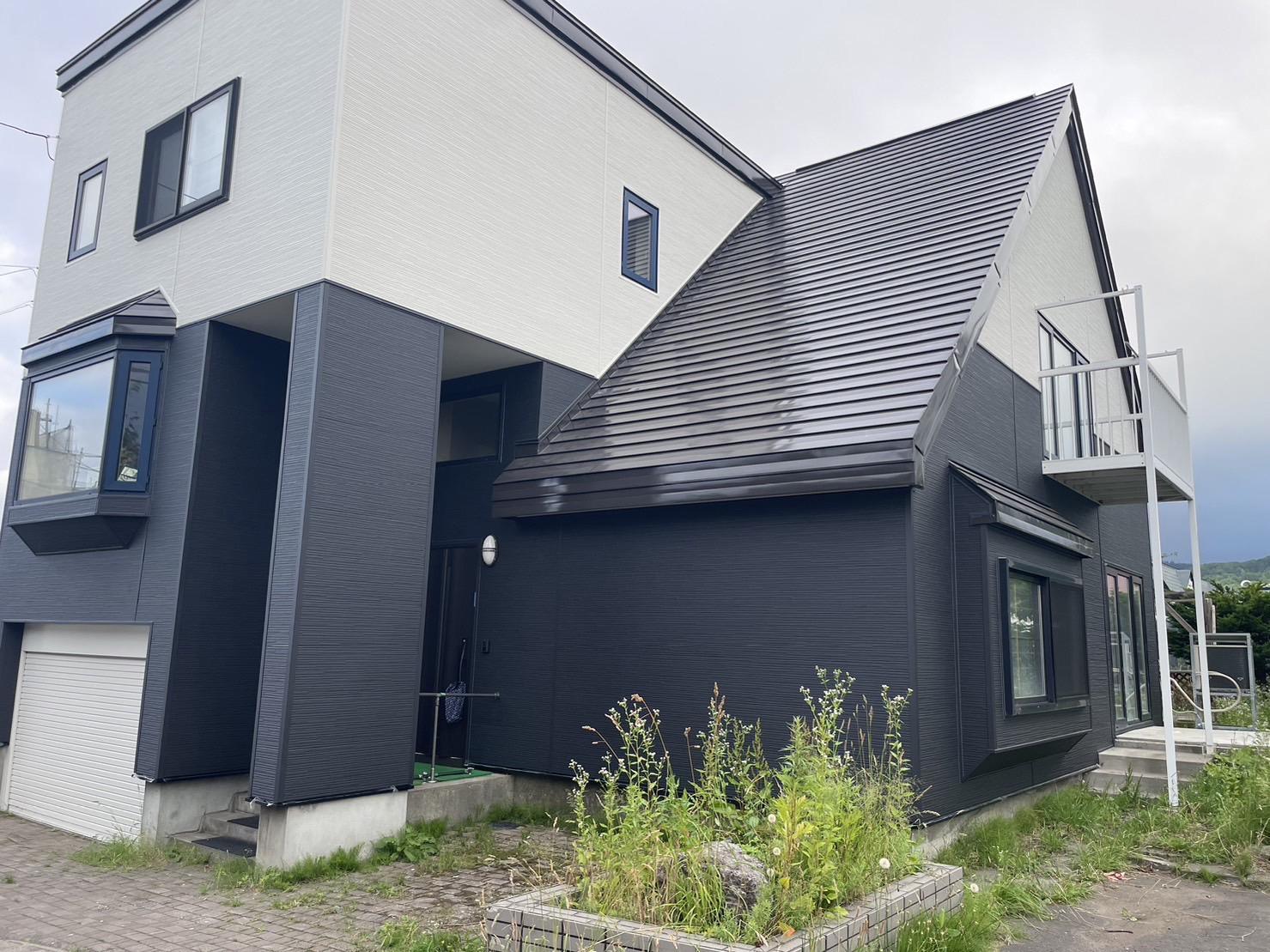 経年劣化で、外壁材がぽろぽろ落ちてきている。屋根も劣化して変色しているので、外壁・屋根工事をお願いしたいとご依頼がありました。外壁材は、ニチハのレフィナウォール上下貼り分けをしており、上がプルクラベージュ、下がプルクラブラック、屋根カラーはチャコールブラックで、外壁材と調和しておりシックでかっこいい印象になりました。