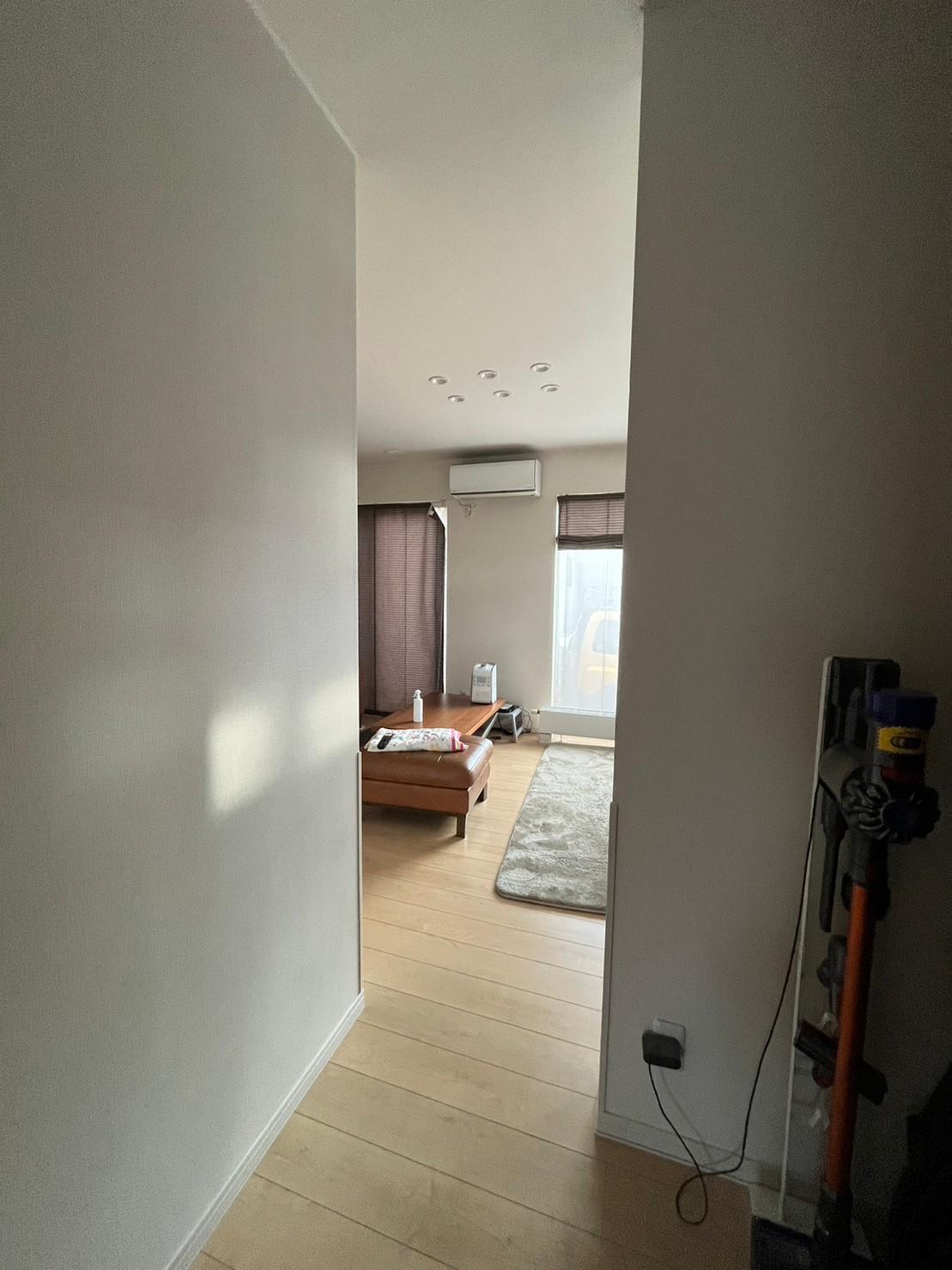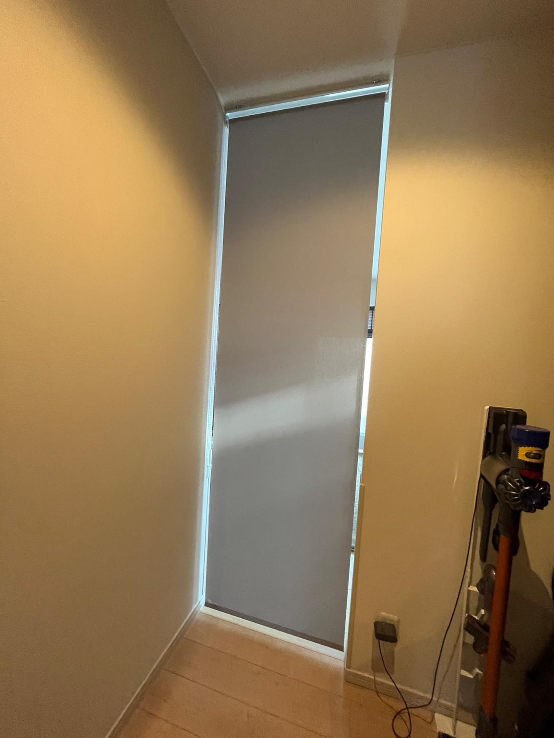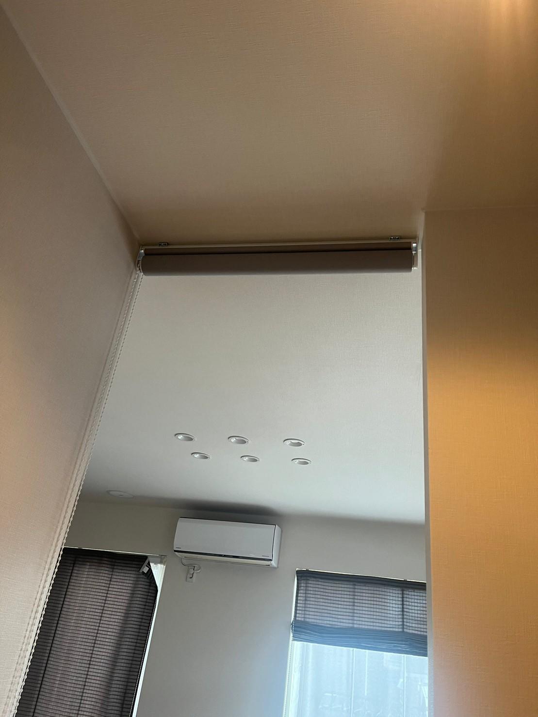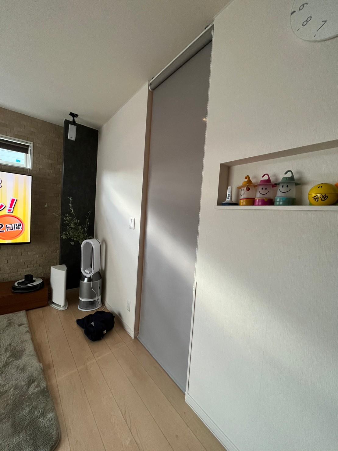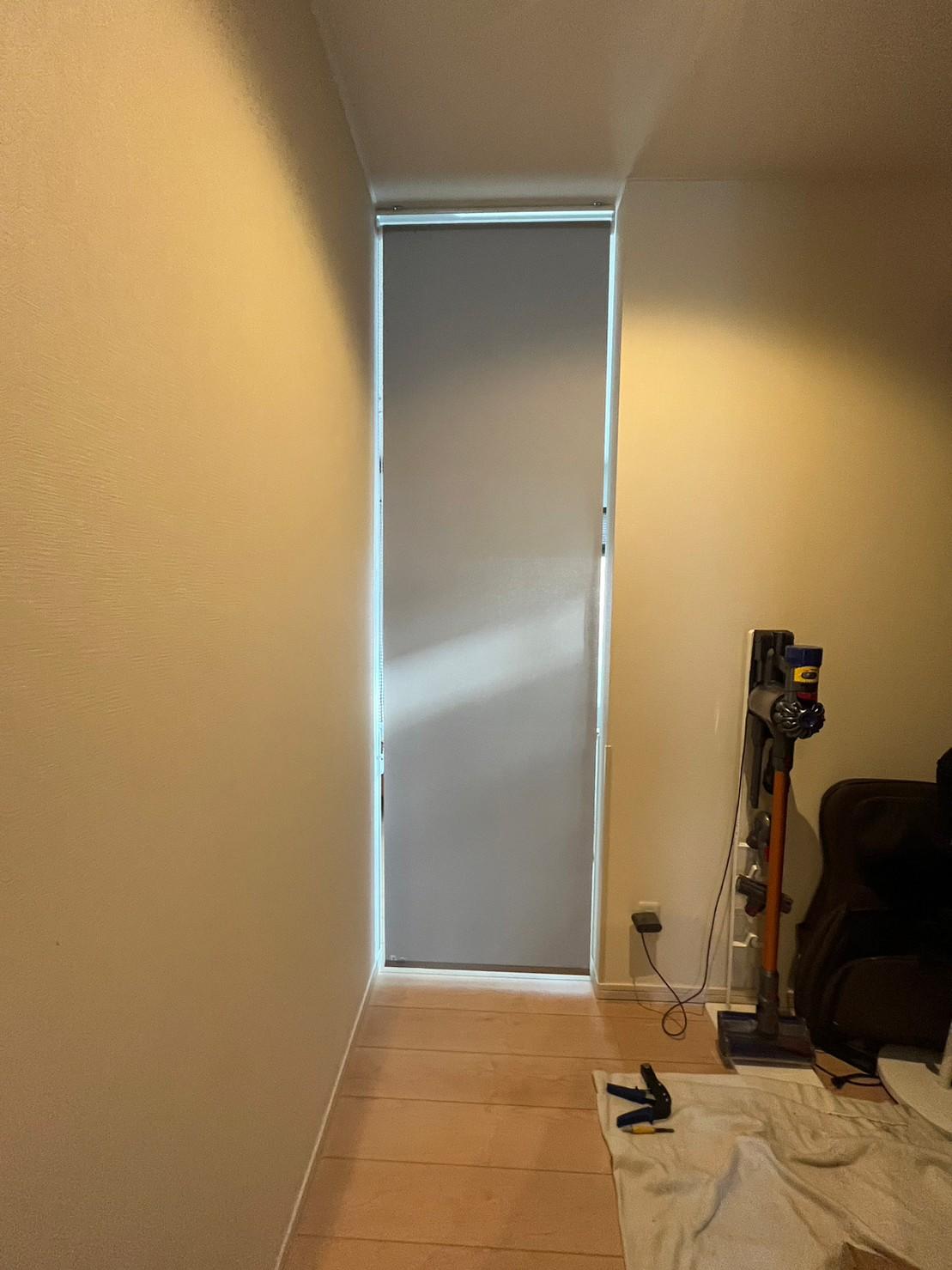 玄関からキッチンとリビング入口に扉がないので、目隠しロールスクリーンを設置したいとご依頼がありました。TOSOのロールスクリーン(グレージュ)を取付いたしました。リビングで使用している冷暖房の空気が玄関に流れてしまうことがお悩みでしたので、室内の空気を逃がさず保てるようにロールスクリーンを活用いたしました。
