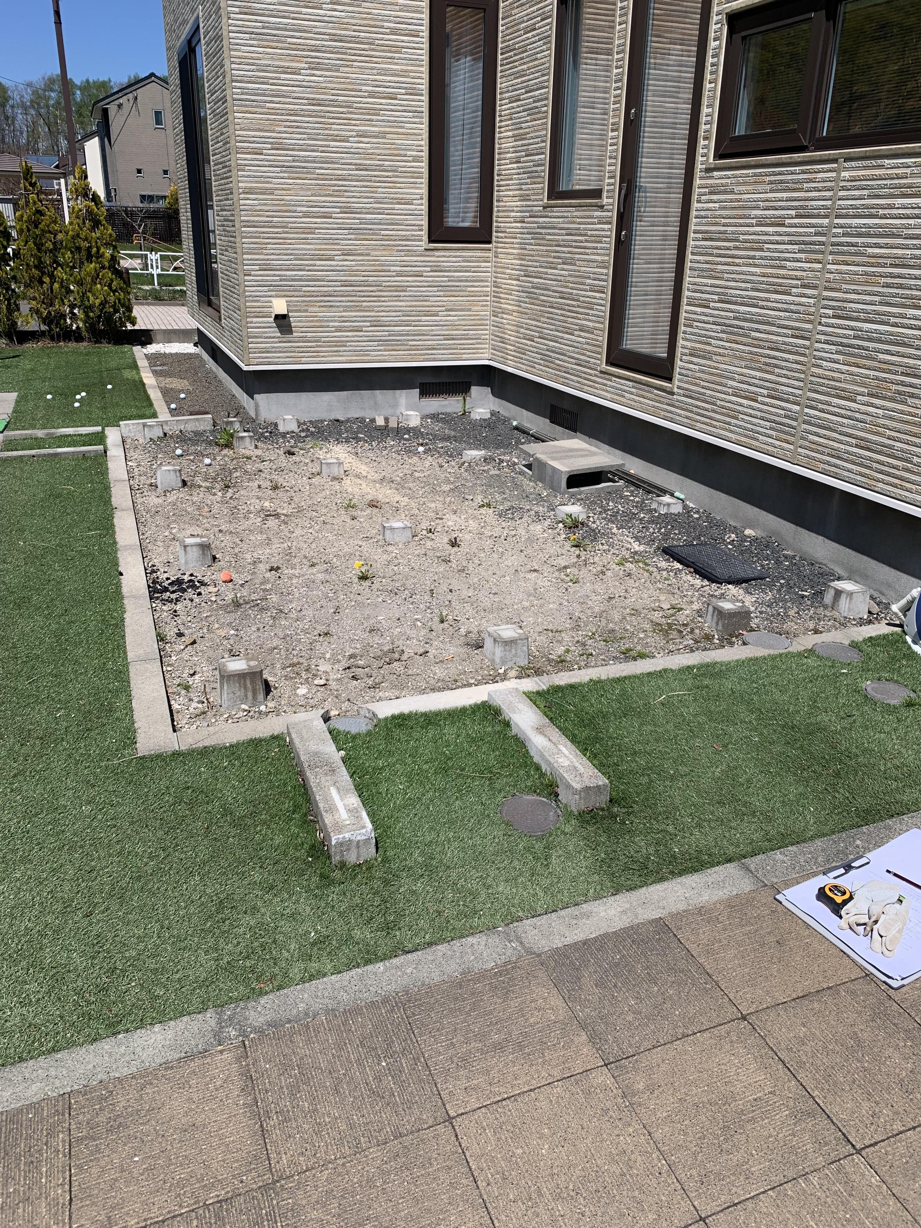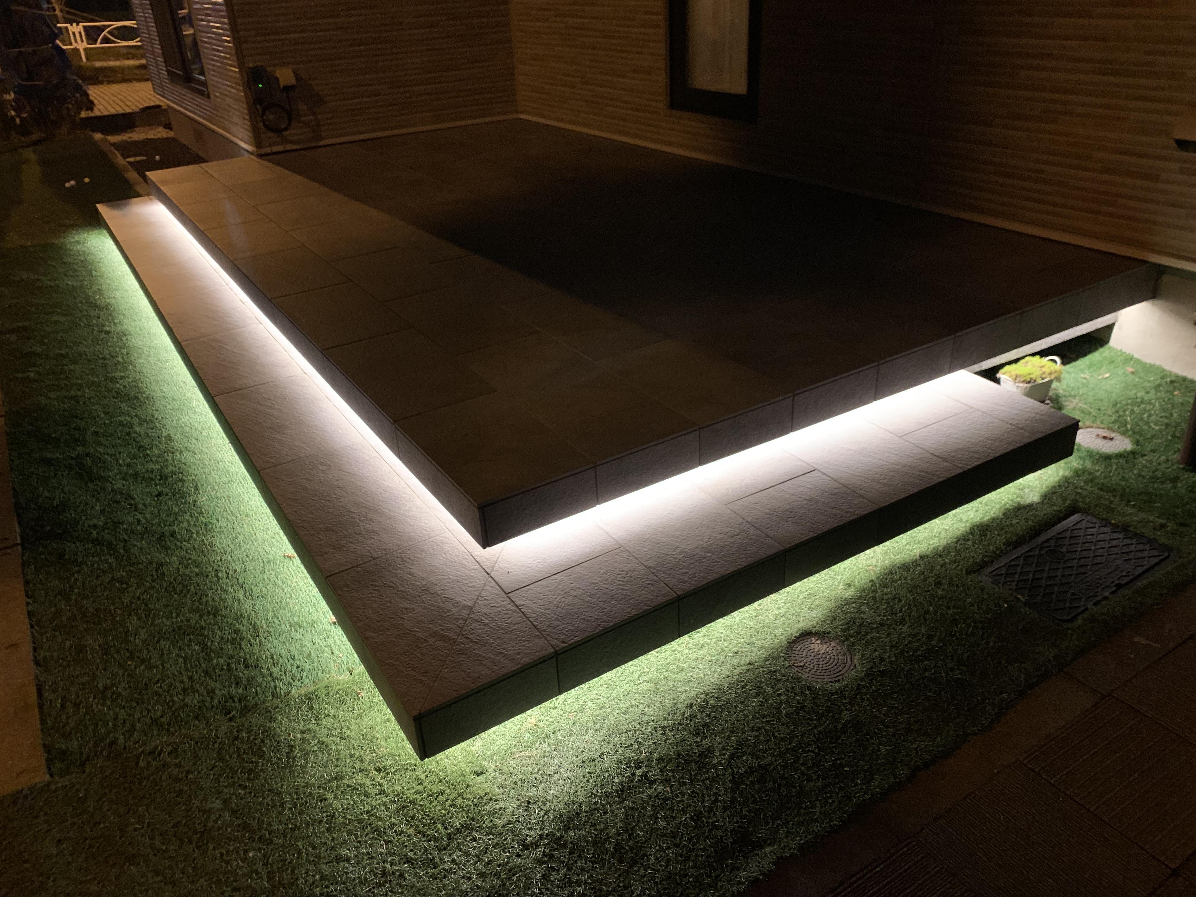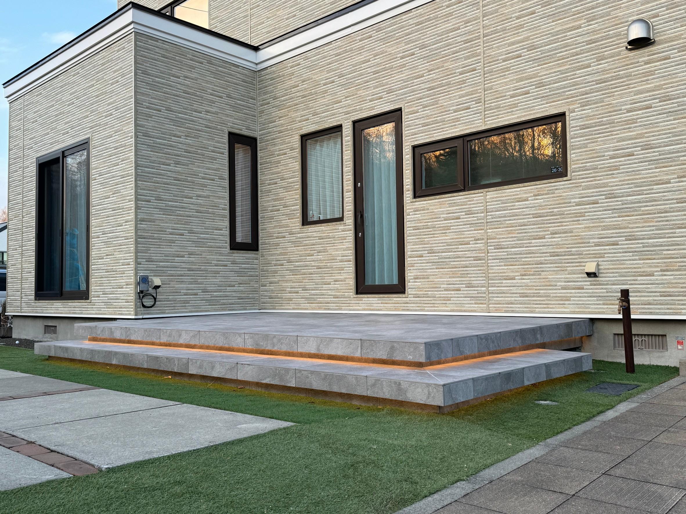 昨年に外壁上貼りの工事をしたので、外構工事もお願いしたいとのご依頼がございました。庭スペースは土間とタイルで仕上げ、ウッドデッキ回りには人工芝を敷き詰め、ウッドデッキには間接照明を取付して夜にはやわらかい雰囲気の外観になりました!