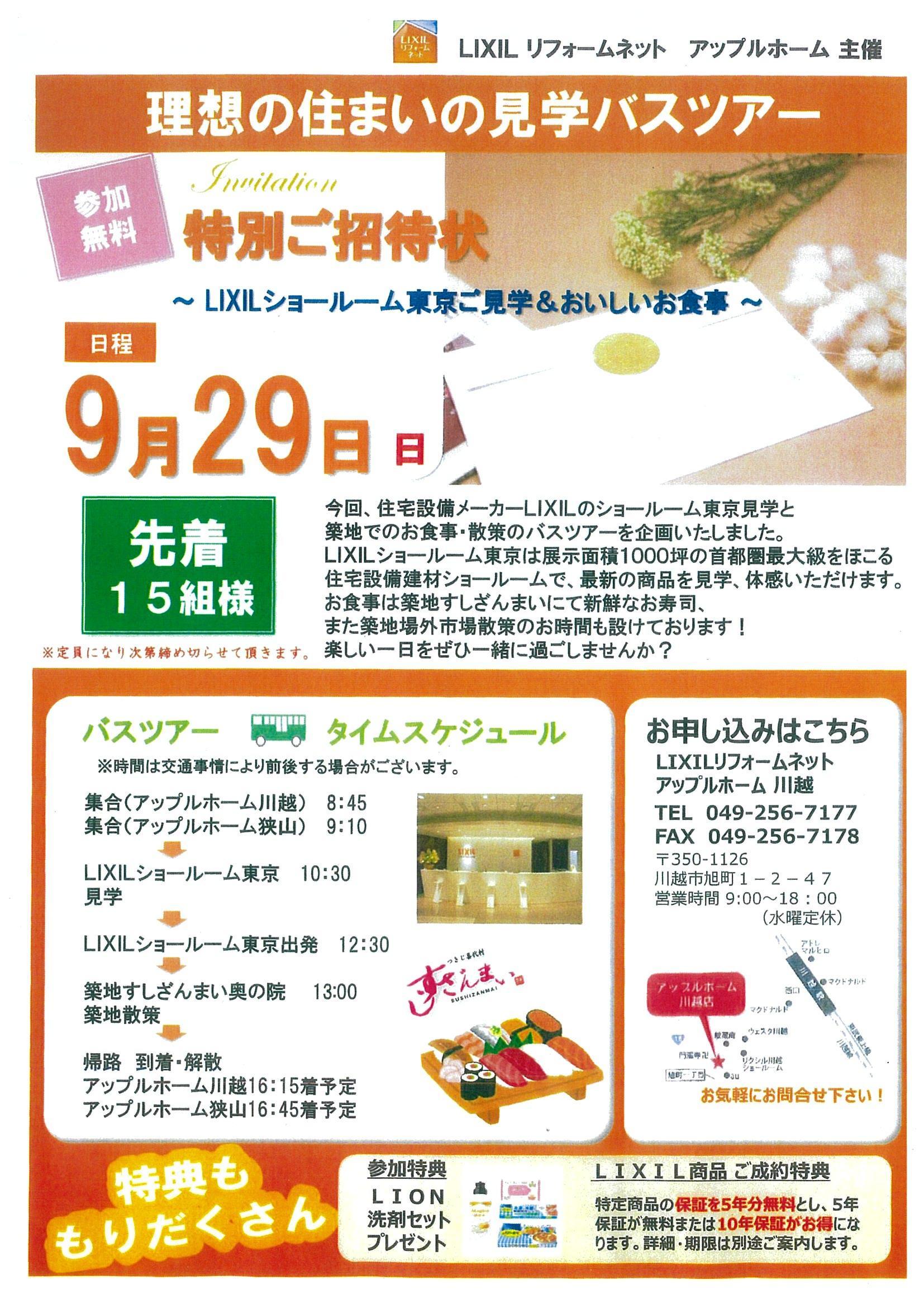 9/29日(日)理想の住まいの見学バスツアー 先着15組様