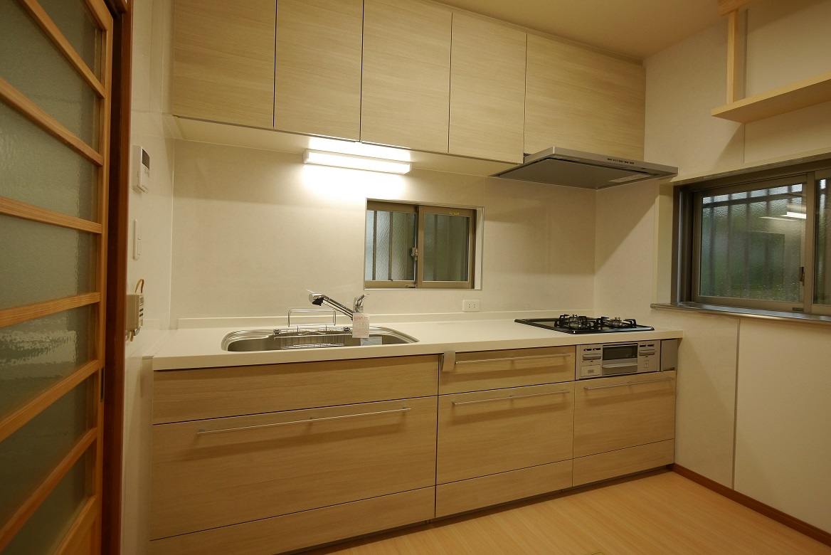 全体に古びて使いにくかったキッチン。収納タップリの明るいキッチンになりました。