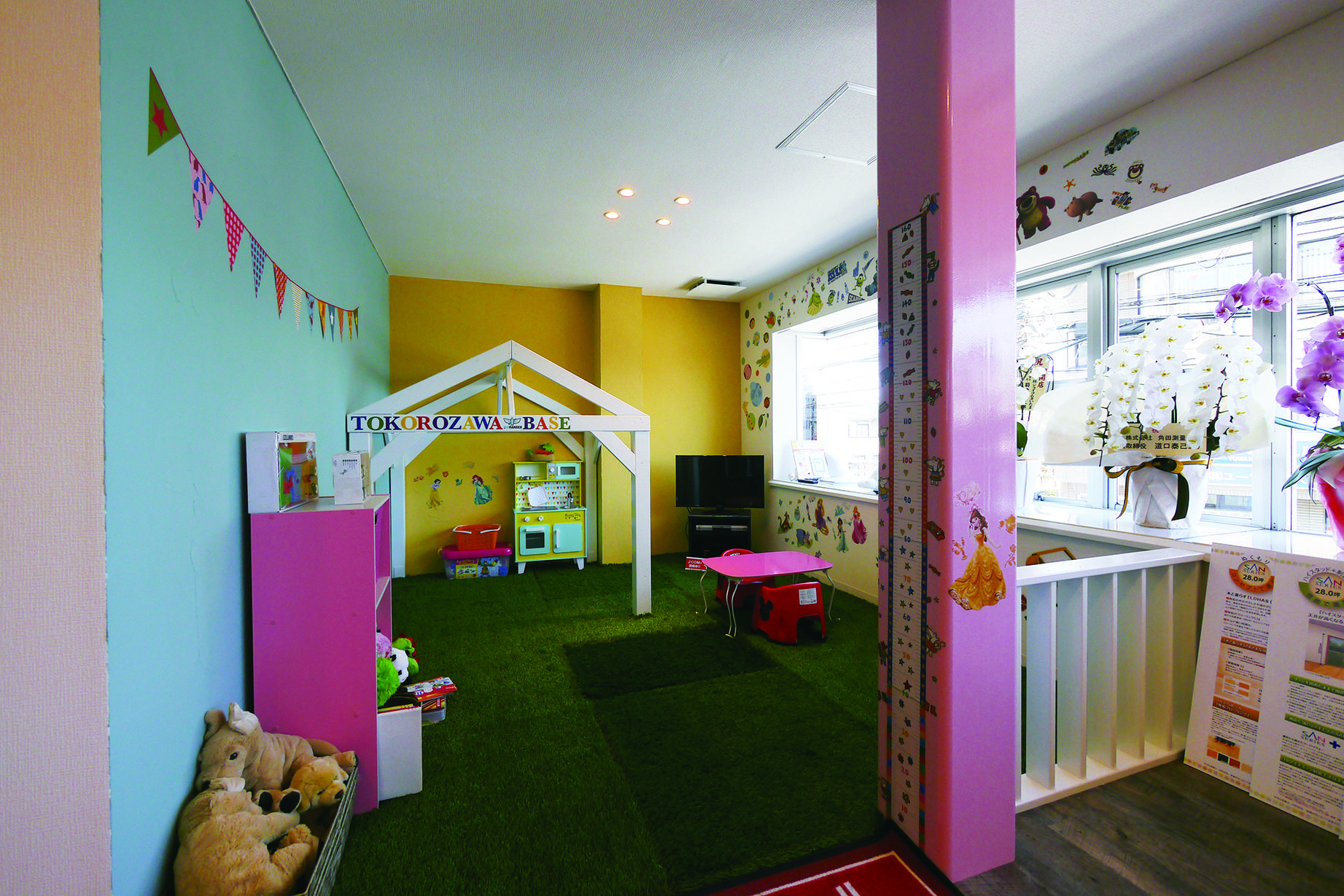 壁・柱をパステルカラーにペイントしました。商談中のご両親の目が届きやすいように壁を設けていません。