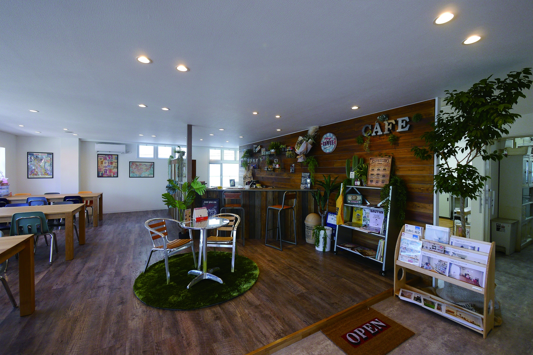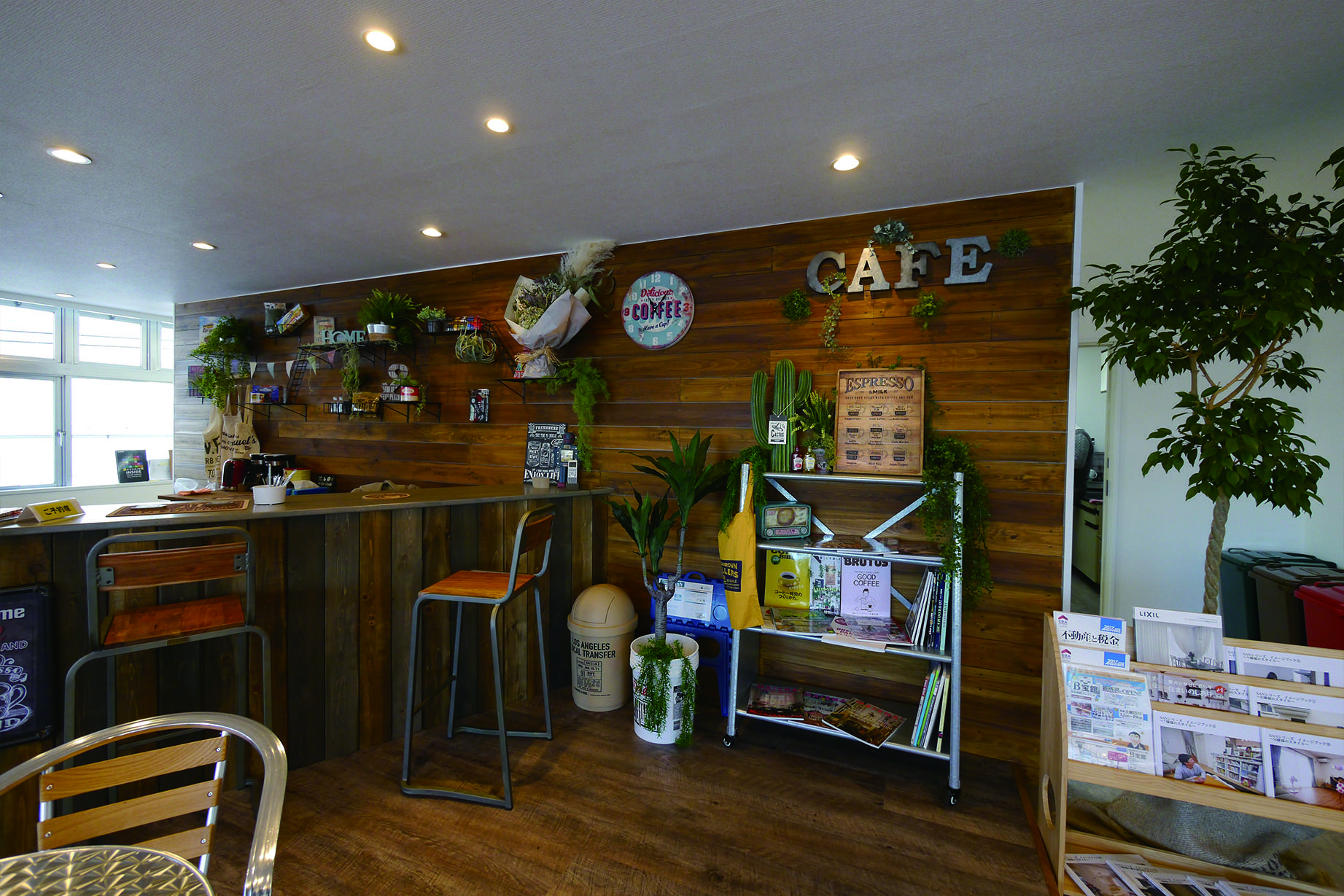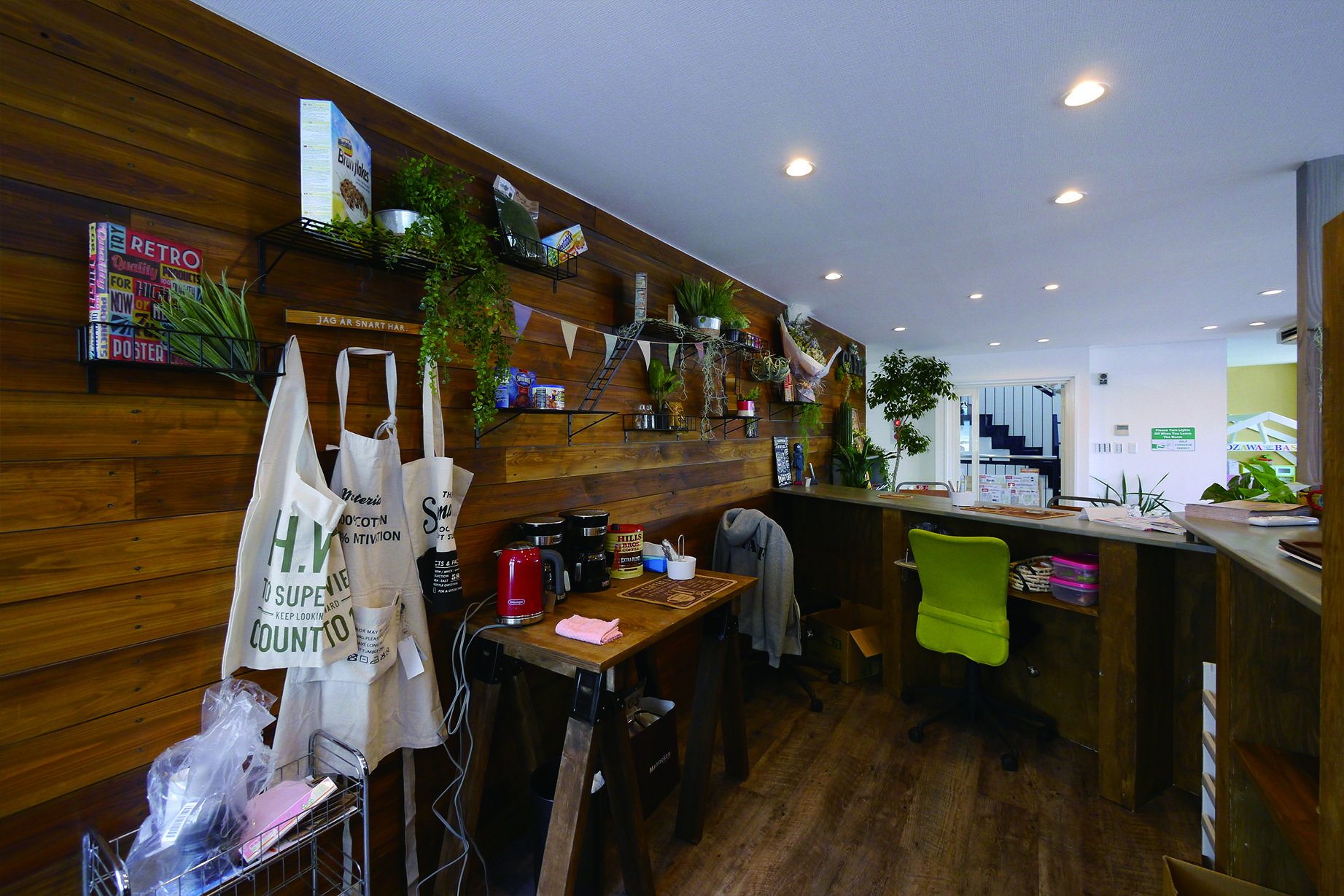 不動産の事務所部分と店舗の間仕切り壁は板張りにしてお洒落なカフェのようなホッとする空間をつくりました。
