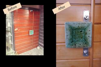 一部のペイントが剥がれかけていた古い玄関ドア。塗装を剥がして磨いたところ美しい木目が現れました。当初はペイントをし直す予定でしたが、この木目を活かして使用することになりました。オーダーで作ったという把手は磨かれた木目との相性もよく、お家の顔として素敵なアクセントになりました。