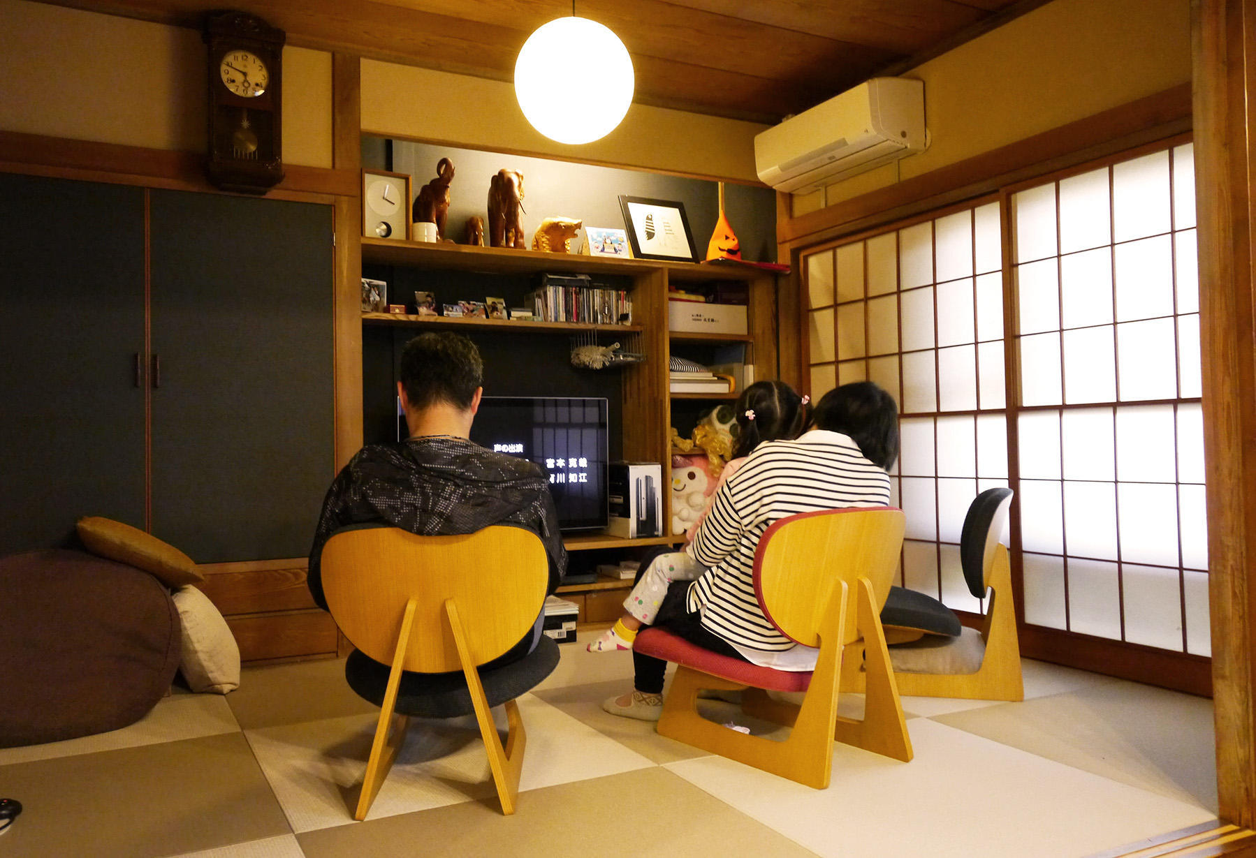 既存のタンス置き場にタモの集成材でテレビボードを造作しました。お子様のアレルギーとデザイン性を考慮して、縁なしの和紙畳を使用しています。