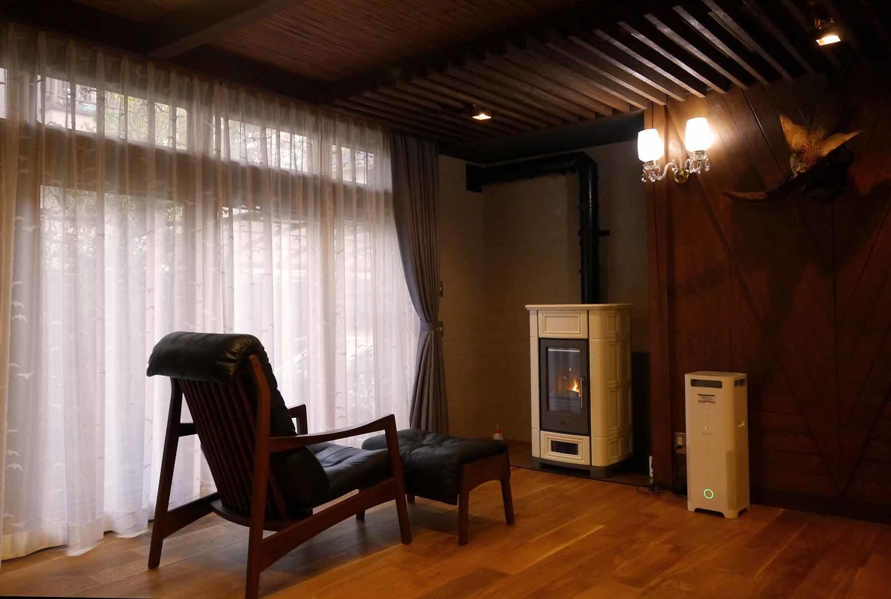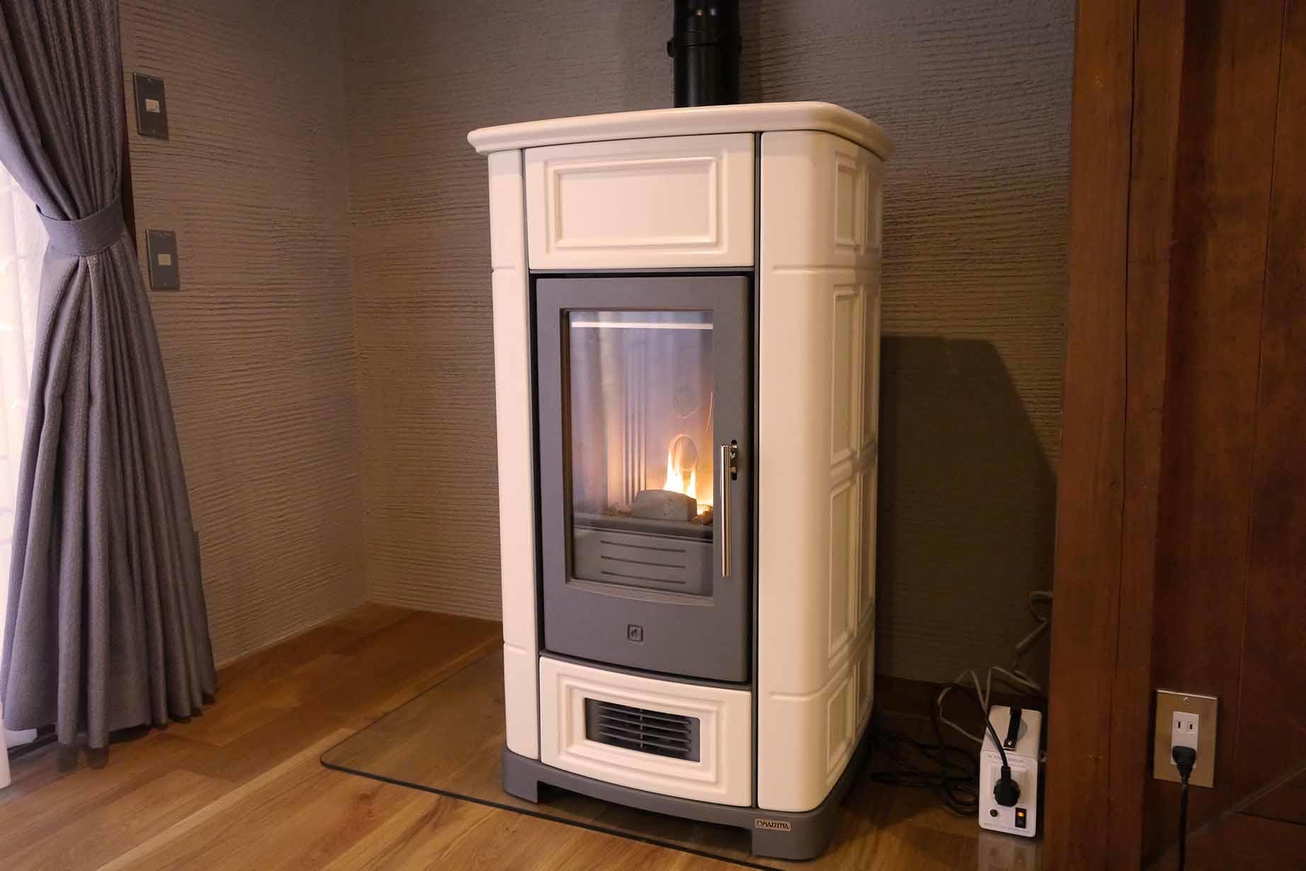 お施主様のたっての希望でリビングに設置したペレットストーブです。1台でLDKと和室まで暖めることができます。また、リビングの床は厚さ18mmの無垢材を使用しており、室内の断熱効果UPが期待できます。