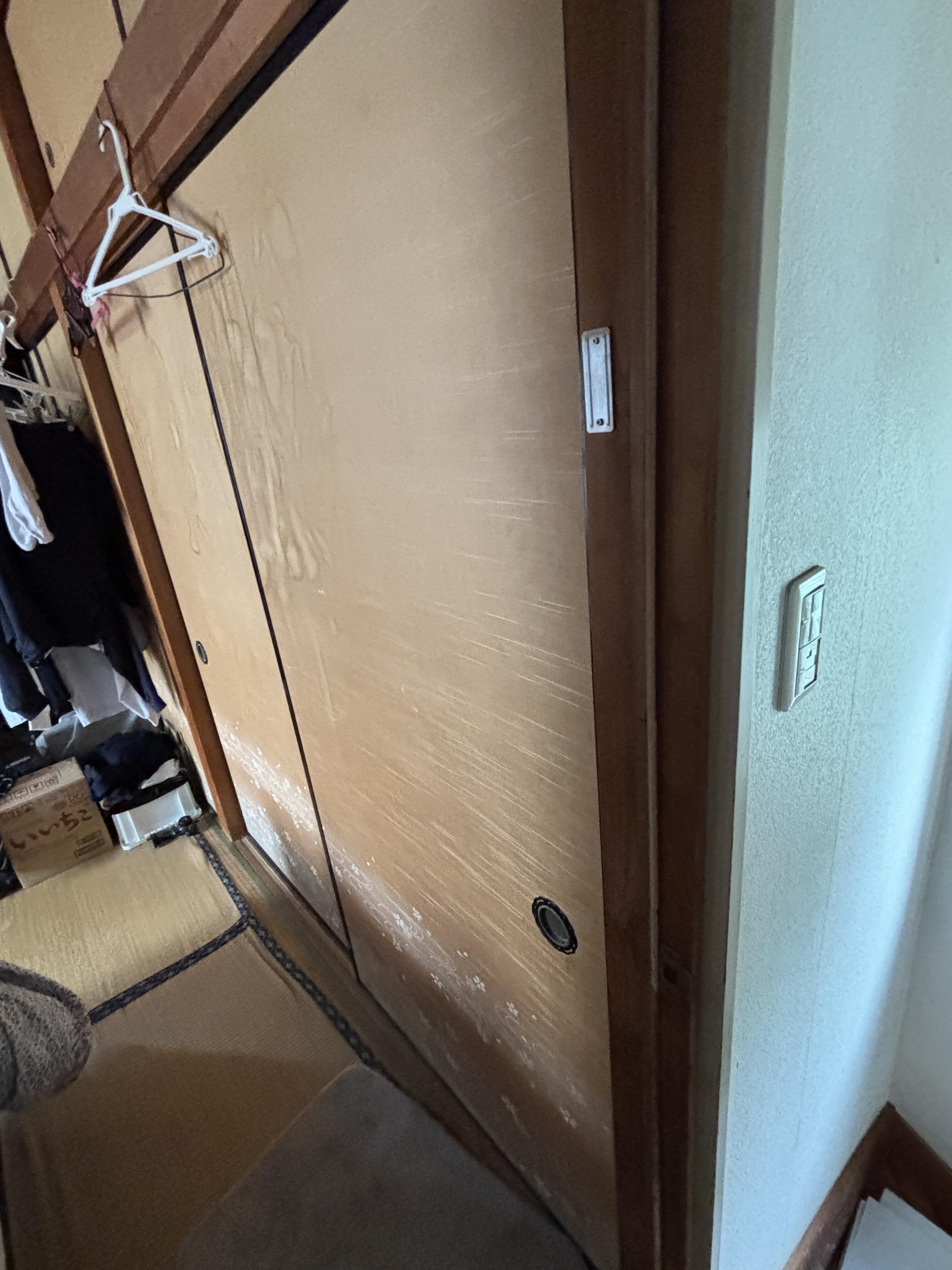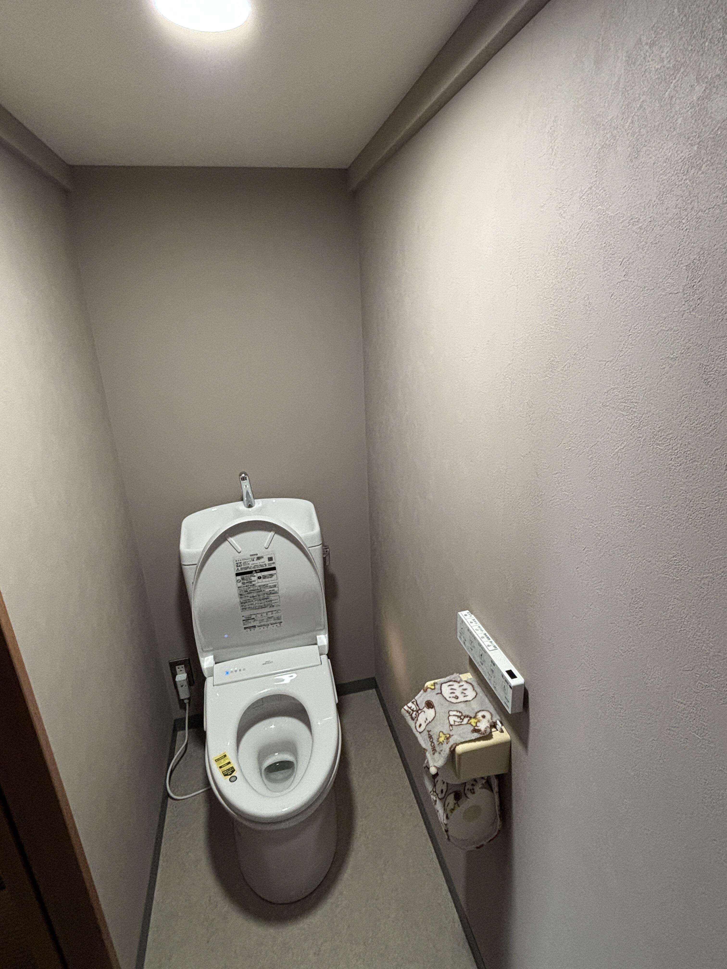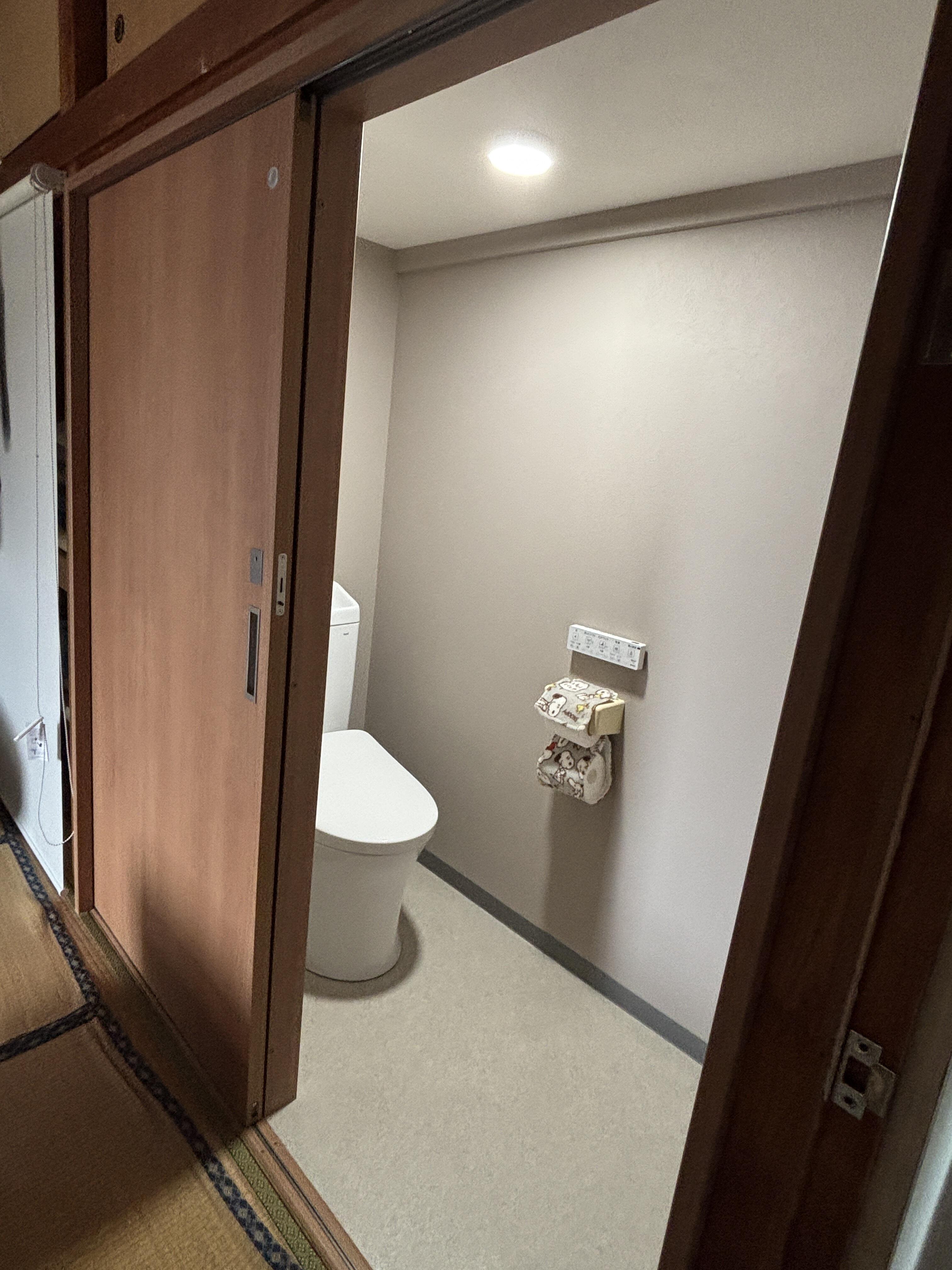 2階にトイレがなく不便とお客様からのご相談があり、和室の押入れをトイレへと換装する工事を行いました。 今回は押入れ内の壁へ上貼りしたうえでクロスを貼り、押入れの襖部分を片引戸へと交換、 2階から床下にある既存の配管へと新設の配管を接続し、トイレを設置しました。