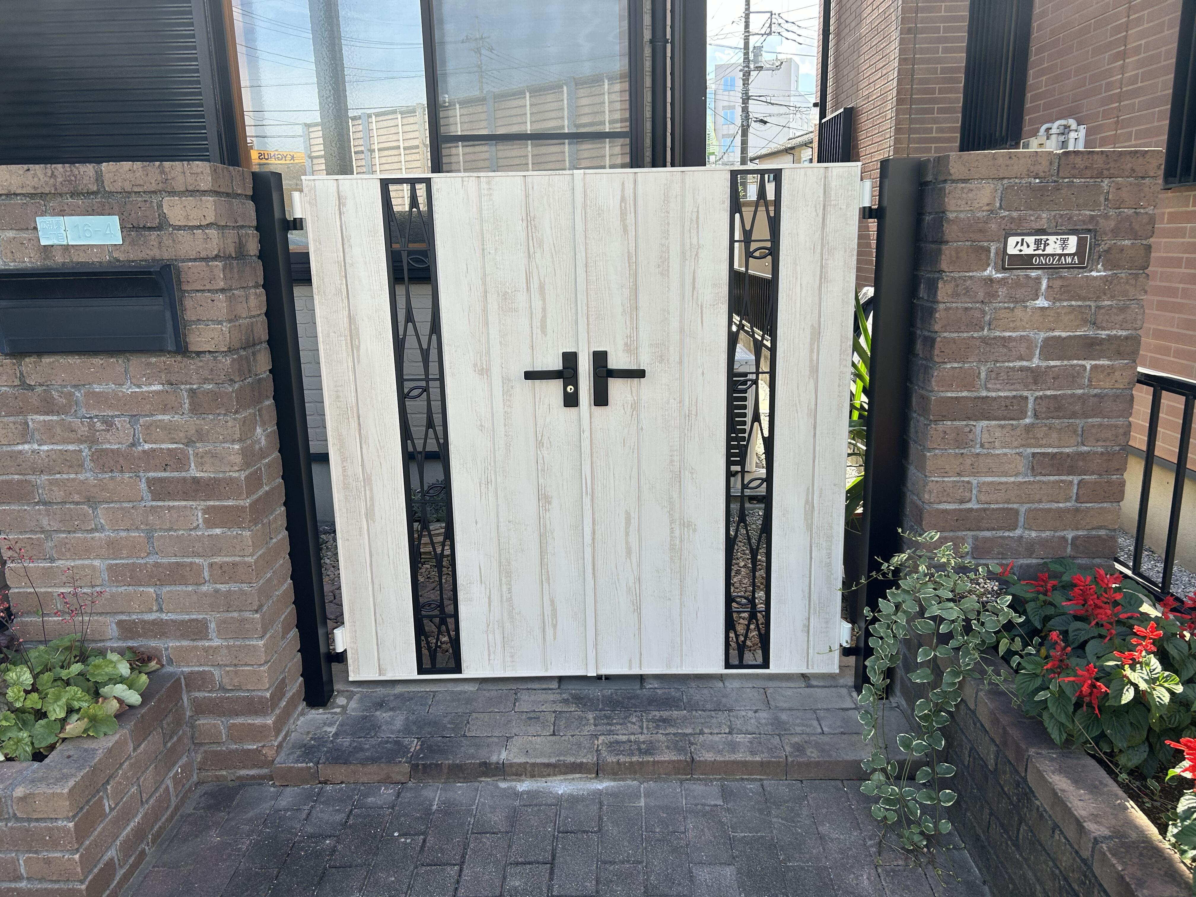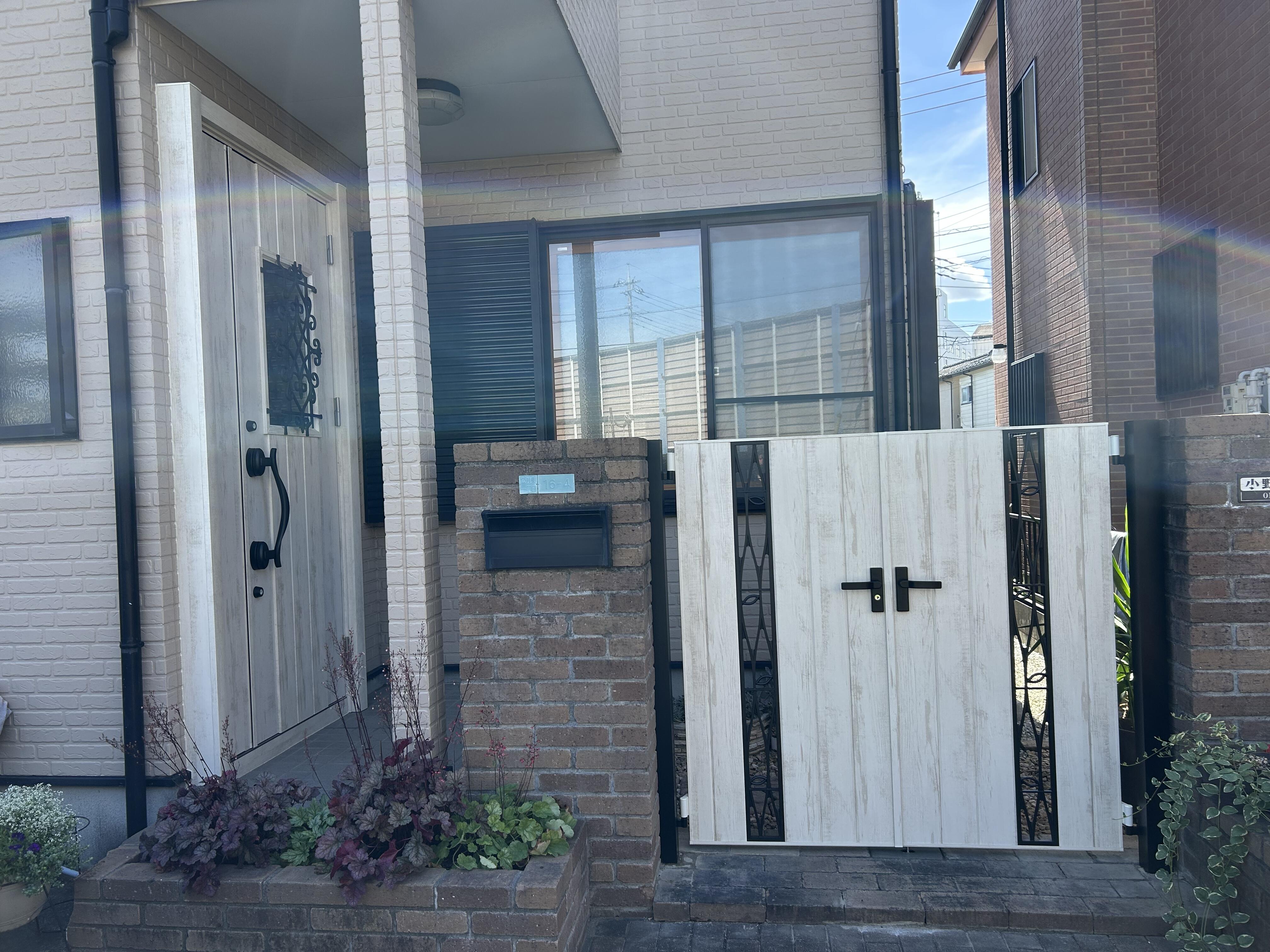 玄関をリシェントで交換、フェンスも同じLIXIL製で色を統一。 可愛らしい入口となりました。